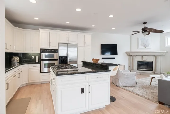 The living area blends seamlessly into a state-of-the-art kitchen, complete with stainless steel appliances, shiny granite countertops, and a sprawling island with barstool lounging. And for those winter nights a cozy fireplace, and plenty of comfy lounge seating.