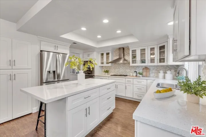 Encino’s Best value! This ideal home is located at the end of a cul-de-sac in the coveted 15 home gated community of Encino Country Oaks. This 4 bedroom approx 2700 sq ft home was custom built by Brian Weinstock and is located in the Hesby Oaks Charter School district. One of the only K-8 options available in Los Angeles. The Contemporary exterior introduces a freshly painted interior with high volume ceilings, custom lighting and walnut wood toned floors. The grand scale great room encompasses a living and dining room with walls of glass and sunlight treetop vistas. An updated center island kitchen with quartz countertops and stainless frig/freezer overlooks a private yard with a full sized sparkling pool/spa, & outdoor living/dining areas. The kitchen is adjacent to a family room with french sliding door access to the yard. This ideal floor-plan offers an attached oversized 2 car finished garage with access to a laundry room as well as a downstairs suite perfect for guests or a home office. The en-suite bath has exterior access for a separate entrance and pool bath. Upstairs are 3 bedrooms with vaulted ceilings. The 2 secondary bedrooms offer designer wallpaper accent walls by Kate Spade & Spoon Flower and a hall bath with chevron pattern white tile floors, dual sinks and a subway tiled shower over tub. The primary suite has a sitting area, treetop views, dual walk-in closets and a luxurious bath with double sinks, marble bath and spa-like shower. This is the one you have been waiting for. Minutes for shopping, commuter routes and the local’s favorite Libbit Dog Park. Come start your next chapter at 5196 Brian Lane.