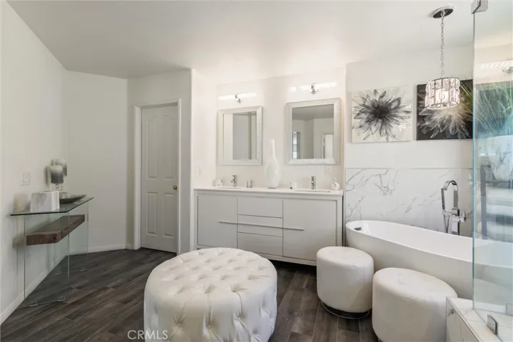 The primary suite showcases a remodeled, spa-inspired bathroom with a freestanding soaking tub, walk-in shower, and elegant designer finishes.