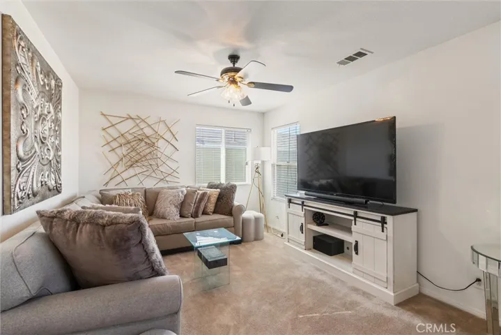 The open floor plan is ideal for entertaining, with a chef’s kitchen offering a large island, granite countertops, and abundant cabinetry that flows seamlessly into the living and dining areas.