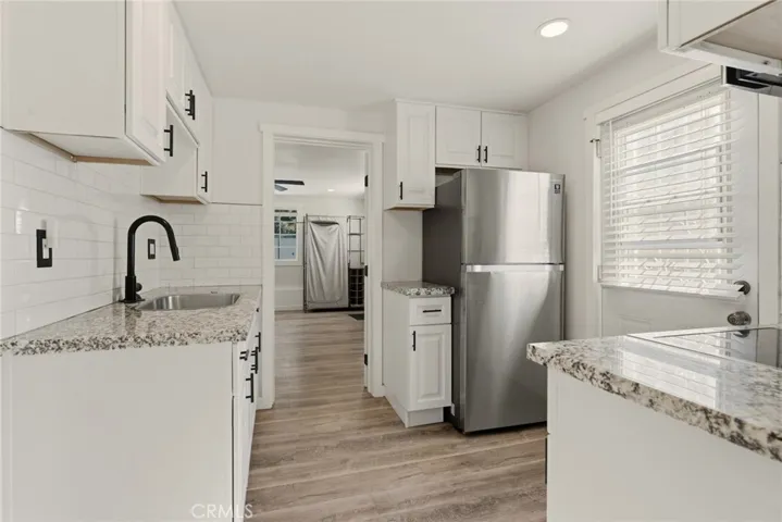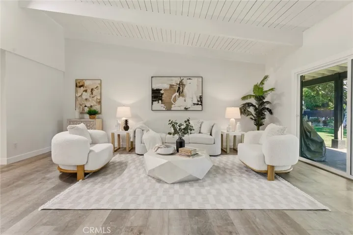 Meticulous and highly upgraded mid-century modern Charles Du Bois single level home! The property sits elevated above the street on a sprawling 11k lot boasting almost 100 feet of frontage adorned with manicured front lawns and lush landscaping. An ascending stone pathway leads to the covered front porch cladded with original stone exterior. Step through double doors into the entry foyer that opens to expansive living & dining rooms each with tongue & groove wood beamed vaulted ceilings, original stone fireplaces, and two sets of glass sliders that open to the backyard for the perfect indoor/outdoor flow. The oversized remodeled kitchen boasts large island with breakfast bar seating, quartz counters with soft close cabinetry, wine fridge, and a suite of Forno stainless appliances including a 60” fridge/freezer and range with double ovens and 8-burner stove with pot filler. The spacious primary suite features high vaulted ceiling, glass slider that opens to the yard, large walk-in closet, separate makeup vanity, and en-suite upgraded bathroom with dual sinks, spa tub, and separate walk-in shower. Two of the secondary bedrooms have high vaulted ceilings and share a spacious remodeled bathroom with new vanity with stone counter, dual sinks, and walk-in shower. There is a separate wing of the home which has both interior and exterior access making it the ideal flex space for extended family, home office/studio space, or great rental income featuring two additional bedrooms, a bathroom with dual sinks and walk-in shower, a separate full kitchen with stainless appliances, and its own private fenced-in yard separated from the main yard with patio, grass lawn, and storage shed. The home also has a spacious laundry room with built-in storage. The entertainer’s backyard has a sweeping covered patio perfect for outdoor dining and lounging, lush grass lawn with mature trees, and large side yard with additional storage shed. Adjacent to dining/shopping at the Westfield Mall/Village, Calabasas Commons, local parks/hiking, & zoned for award-winning El Camino & Hale charter schools.