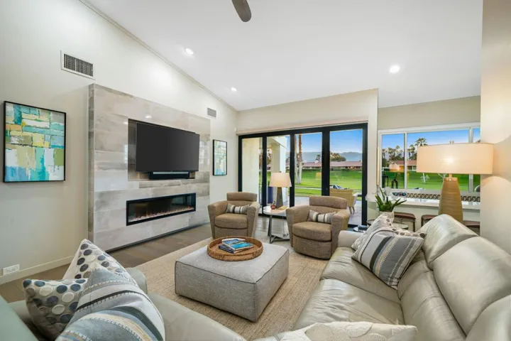 REMODELED. FURNISHED. PANORAMIC MOUNTAIN VIEWS. 32 OWNED SOLAR PANELS.Every once in a while, a home comes along that simply takes your breath away, this fully remodeled and furnished Bayberry Plan is that home. With panoramic mountain, golf course, and sunset views, luxury finishes, and every imaginable upgrade, it’s the perfect blend of sophistication and ease.The Chef’s kitchen is a true showpiece, where culinary artistry meets everyday luxury. Outfitted with Bosch, KitchenAid, and Thermador appliances, custom cabinetry with interior storage drawers, and sleek quartz countertops, every detail has been thoughtfully designed for both beauty and function.The expansive great room flows seamlessly through folding glass doors to an incredible outdoor living area, capturing that quintessential indoor-outdoor desert experience. Rich engineered wood flooring, automatic blinds, and new windows and sliders fill the home with warmth and light.The primary suite is pure serenity, a spa-like retreat with redesigned bath, custom cabinetry, new sinks and toilets, and resort-inspired finishes. Custom closets and plantation shutters complete the space, while two guest suites feature private baths and window shades. A stylish powder bath adds convenience for guests. Outdoor living reaches new heights here. The spacious south-facing side yard provides extra room and sweeping Southern mountain views, while the west-facing patio captures spectacular sunsets over the 5th green. The electric awning offers shade for lazy afternoons, and the tiled courtyard with a tranquil fountain welcomes you home with peaceful desert ambiance. Every upgrade has been executed with care: 32 owned solar panels, two high-efficiency Trane heat pumps, tankless water heater with Instant Hot, custom built-ins, and all new toilets throughout the home. The garage impresses with epoxy flooring, built-in cabinetry, extra storage, mini-split AC, and a golf cart garage.Privately tucked at the end of a quiet cul-de-sac and just steps from a community pool, this home embodies luxury desert living. At the heart of Desert Horizons, the newly reimagined 40,000 sq. ft. Clubhouse offers elevated dining, vibrant social spaces, and stunning event venues. The 8,000 sq. ft. Fitness & Wellness Center features panoramic views and top-tier equipment, while the brand-new Sports Pavilion offers two tennis courts and eleven premier pickleball courts for every level of play.