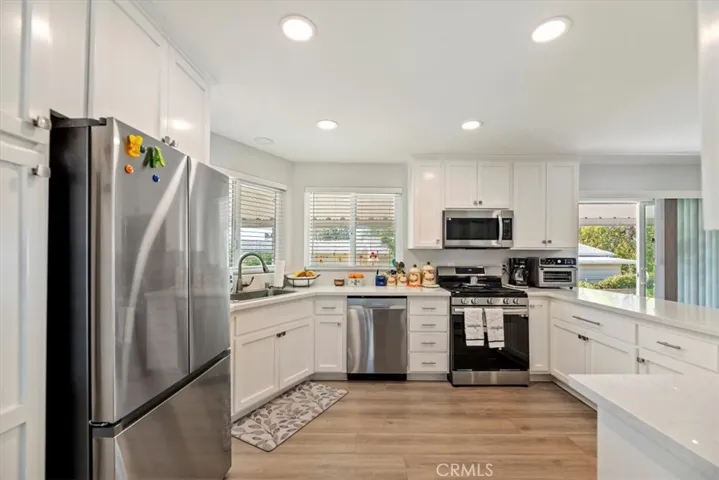 Step inside to high ceilings, recessed lighting, and wide-plank white oak-style flooring that flows across an open floor plan. The stunning remodeled kitchen shines with shaker cabinetry, quartz countertops, pull-out shelving, soft-close drawers, stainless steel appliances, and backsplash — truly a gourmet space. Double-pane windows offer energy efficiency and quiet comfort.