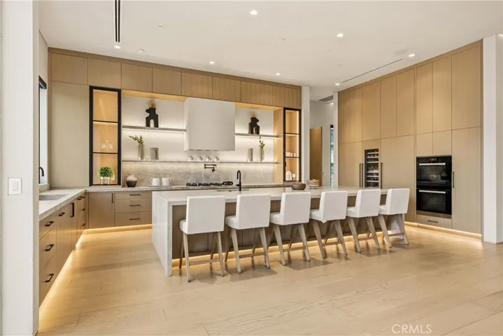 The open-concept layout flows into a gourmet kitchen that’s a dream for culinary enthusiasts and entertainers. Taj Mahal stone countertops and state-of-the-art appliances set the stage, complemented by a secondary “dirty kitchen” for additional prep space. A custom Taj Mahal dining table serves as an elegant centerpiece for memorable gatherings.