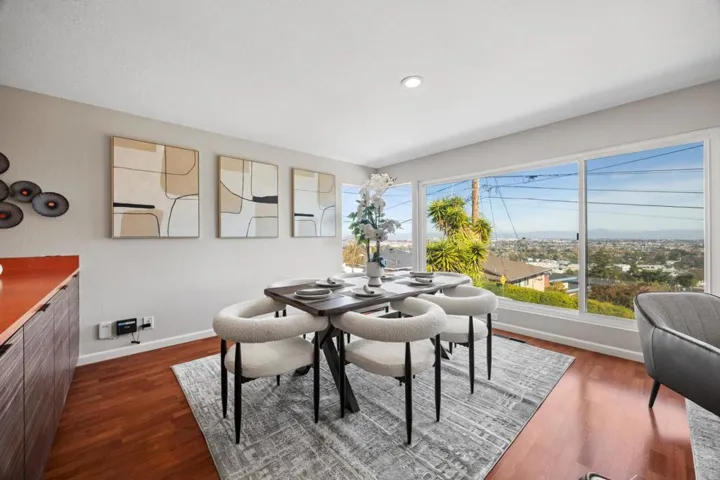 Bay Views during the Day – Acres of Diamond Lights in the Evening. Total move-in condition. Light flows throughout the rooms from the almost new Milgard custom dual pane windows. New paint throughout the entire interior. Engineered hardwood floors. Refaced Kitchen cabinets. Quality stainless steel appliances. Kitchen and Living Room – Dining Room Combination open to straight on Bay and Neighborhood Views. Newer vanities in both Bathrooms. Refinished with white gloss – shower and bathing tub. Updated electrical. Newer Bitumen Roof. Spacious Primary Bedroom. Rear two Bedrooms with plenty of light and closet space. Interior Laundry area with storage cabinets. Low maintenance rear patio nicely extends the living area. Space insulation with the expansive upper hill. Endless possibilities…Garden? Pets or Children at Play? Downstairs is the spacious 2 Car Garage with storage under the stairwell plus high ceiling. Extras include air conditioning, updated tile bathroom floors, new stairwell railings. Nestled in the lower Belmont Hills, near shopping, restaurants and transportation. Just moments away from 101 and 92. Truly, the only thing missing is you.