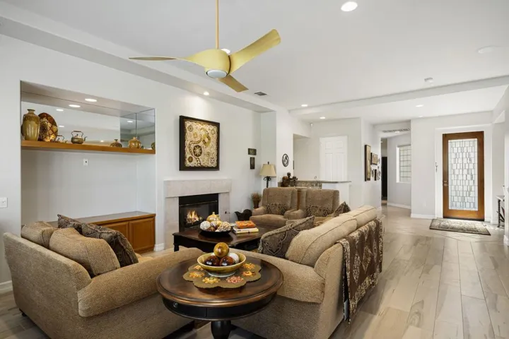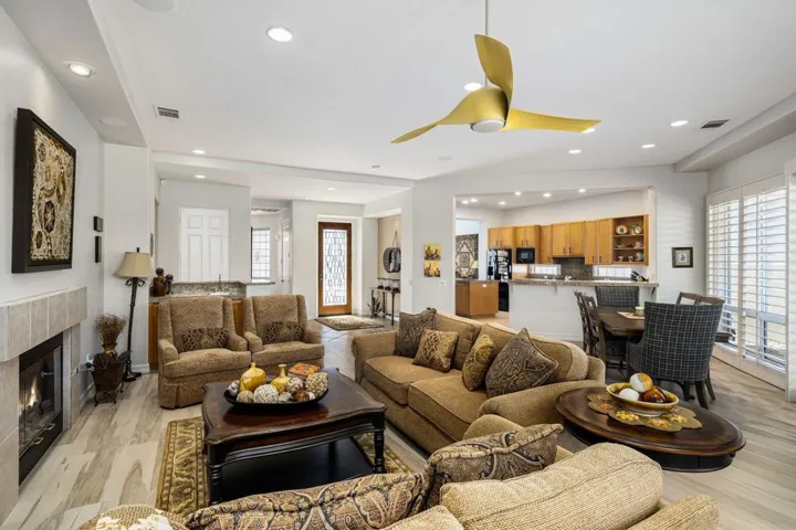 This popular floorplan has a spacious courtyard entry offering stunning south-facing mountain views, creating a warm and inviting first impression. A glass front door welcomes natural light into the foyer and expansive great room beyond.Featuring light wood-look porcelain tile flooring, seamlessly blended with diagonal tiles throughout. Painted wood shutters adorn most windows and doors, adding charm and character. Each generously sized bedroom includes an en-suite bath, ensuring comfort and privacy for all. The third bedroom has french doors to the courtyard and can serve as an attached casita. The luxurious primary suite boasts direct access to the backyard, where a pool and spa provide a private retreat. Drift off to sleep with the soothing sound of the spa waterfall just outside your window. The garage is temperature controlled with a mini-split and the garage floor is custom installed rubber tiles in shades of gray. Lucky cars! Meticulously maintained, this home is a true gem in La Quinta Fairways, a guard gated community located conveniently in the middle of La Quinta, close to restaurants, groceries and shops. La Quinta Fairways is one of four key associations affiliated with PGA West. OPEN HOUSE: Saturday 11-2