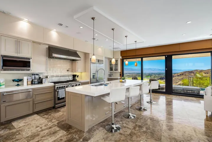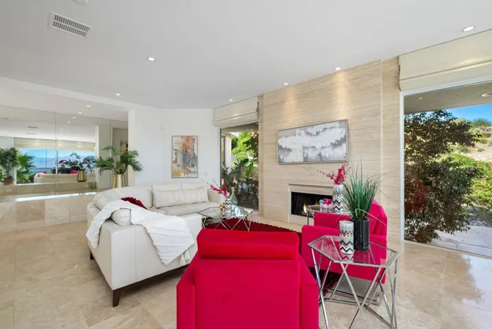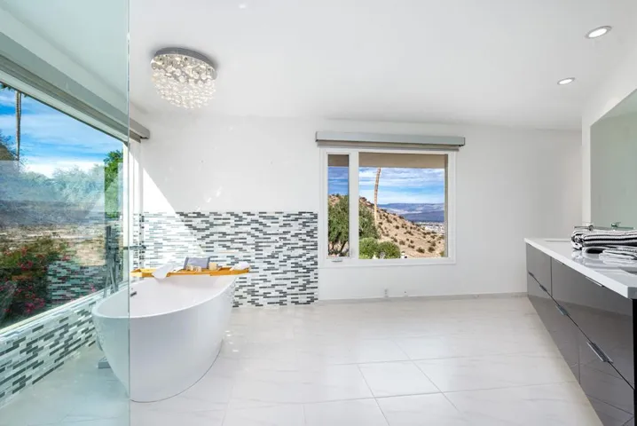 Breathtaking 270-degree views from this spectacular home in famous Southridge, an exclusive gated 22-home community nestled in the mountains and known for its long history of celebrity-owned homes, including those of Bob Hope, Steve McQueen, William Holden, Suzanne Somers, and the Elrod House, to name a few. This updated Mid-Century Modern home offers 270-degree views, including the Valley Floor from Palm Springs to the Salton Sea. The home offers five ensuite bedrooms, a powder room, and boasts a bright and open floor plan, extreme privacy, a quality pool/spa, a large patio with a built-in barbecue, and a private fire pit on the SW corner of this estate-sized lot. There’s an additional private spa on the east side of the patio, offering the same spectacular Coachella Valley views and city lights at night. The perfectly appointed Chef’s kitchen, floor-to-ceiling glass walls, ceiling fans, wet bar, electric blinds throughout, and the second workout room (converted from a 3rd garage stall) all make this home special. The second level offers one primary bedroom with a fireplace, a recently updated bathroom, a walk-in shower, a standalone soaking tub, a large walk-in closet, sliders to your private deck, and a separate lock-off office. An additional upstairs ensuite bedroom/exercise room has its Private ‘Zen ‘ deck. Downstairs, you will find one more Primary Suite and two other En-Suite bedrooms, plus a powder room for your guests. Furnished per writtenInventory. Easy to show on short notice. You can contact either of the Listing Agents for a showing. Rick Parnell 360-280-4178 or Mark Brack at 760-515-7215. The Listing agent must accompany all showings. It is an exclusive neighborhood, and all visitors need to be accompanied by the listing agent.