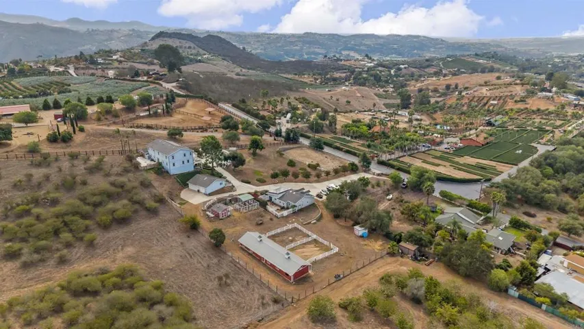 Seller will entertain offers between $2,144,000 – $2,250,000. Incredible versatility and stunning panoramic views await at this equestrian estate, which features THREE RESIDENCES on a highly developed 2.35 acre lot. The 3,465 sq ft main house offers soaring ceilings, beautiful finishes, a whole house fan, central vac, laundry chute, sub-level with more storage, 4 bedrooms AND an attached 1 bed/1bath apartment with a separate entrance. The 1,100 sq ft detached guest house offers 3 beds (1 is an optional bedroom/den), 2 full baths and a private backyard. There is new HVAC equipment for all 3 residences and owned solar energy systems on both the main house and detached guest house. Another detached building houses a 3-car garage and bonus room (currently used as an office) with a half bath. Enjoy a NEW high-end pool with a safety enclosure, large patio, waterslide, grotto, LED lights, and AOP Ozone system for excellent water quality. Rinse off after a swim in the enclosed outdoor bathroom with a shower. A charming red barn offers 2 oversized stalls with runs, a hay room and a tack room. An outdoor riding arena completes this amazing horse property. A large chicken coop with run is set up for collecting fresh eggs each morning. Multiple fruit and avocado trees and large planter boxes complete the home garden. This fully-fenced property with a gated driveway is located on a well-maintained private road in Bonsall, only 30 minutes from the beach in Oceanside. Experience coastal breezes and even a view of the ocean on a clear day from this hilltop property!