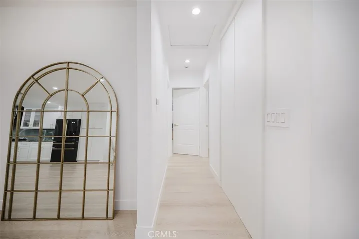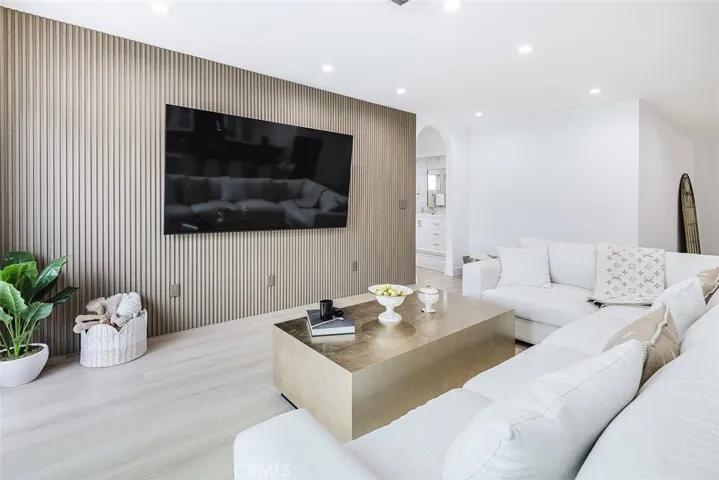 Inside discover an inviting living room that flows seamlessly into the formal sitting area and dining space, perfect for entertaining. The remodeled kitchen is a showstopper with sleek white cabinets accented by gold hardware, high ceilings, recessed lighting, and all appliances included.