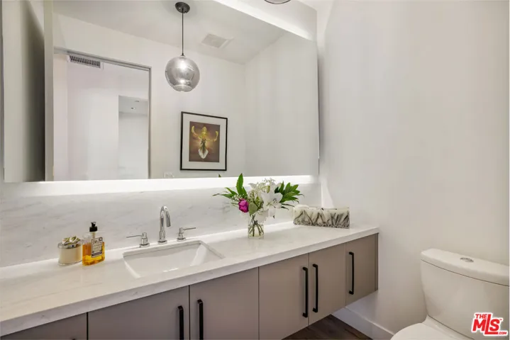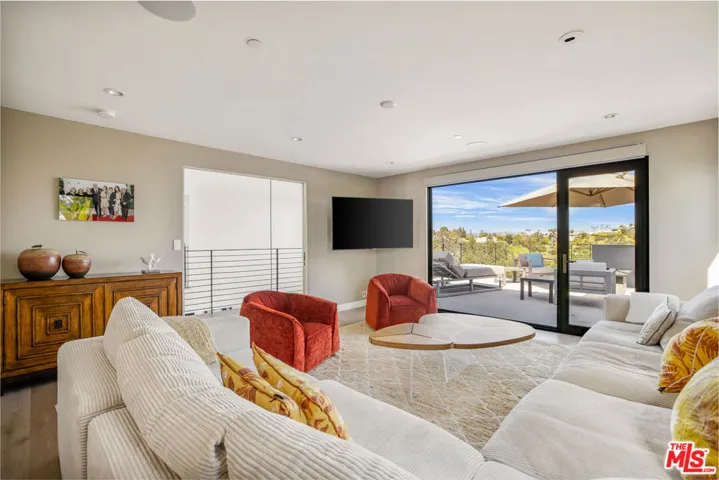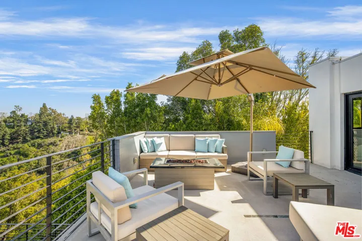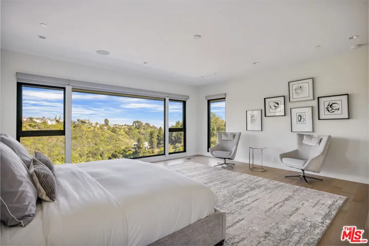 This contemporary estate is brand new and located in Bel Air, offering breathtaking panoramic views from almost every room. As you step into the foyer, which features double-height ceilings and expansive windows, you will fall in love with the property. The open floor plan is ideal for indoor outdoor living, and the luxurious living area boasts a bar and sliding glass doors that open up to the deck. The chef’s kitchen includes stainless steel appliances, a breakfast bar island, and an accordion window that opens to an outdoor bar. Enjoy summer evenings with friends and family in the dining room, featuring a two-story window and chandelier. The upper level features a living space with a balcony and en-suite bedrooms, accessible by a railed walkway. The master bedroom offers stunning views over Bel Air, a walk-in closet with built-ins and a center island, a tub, a dual sink vanity, and a glass shower. Relax in the garden surrounded by breathtaking views, seating areas, a dining space, and a pool with a spa. This state-of-the-art smart home is designed to cater to all lifestyles with just a touch of a button.