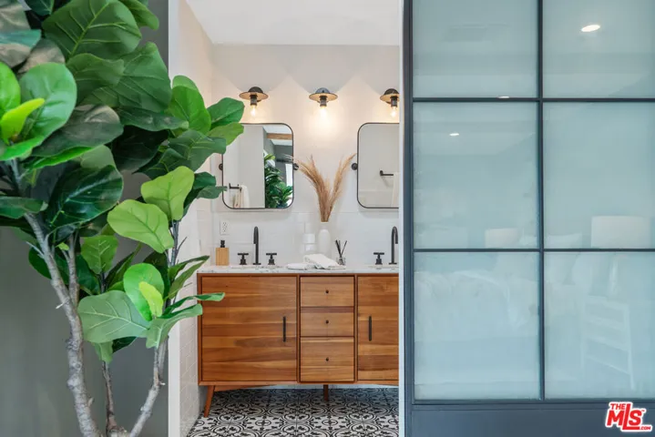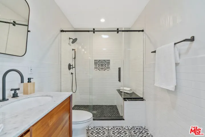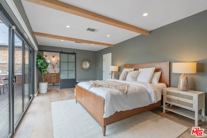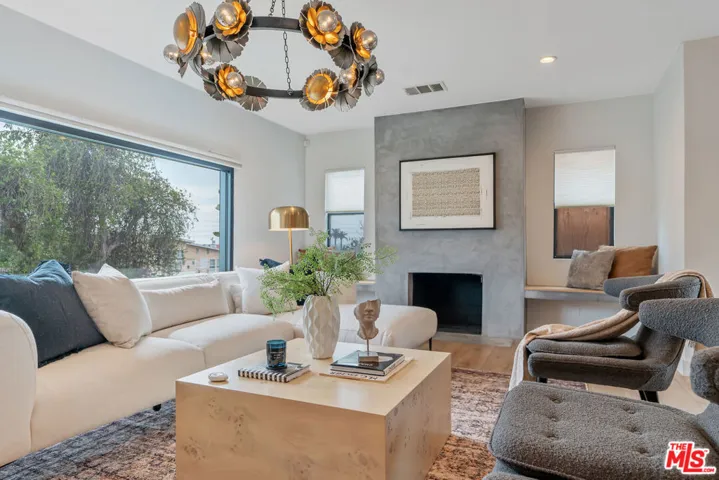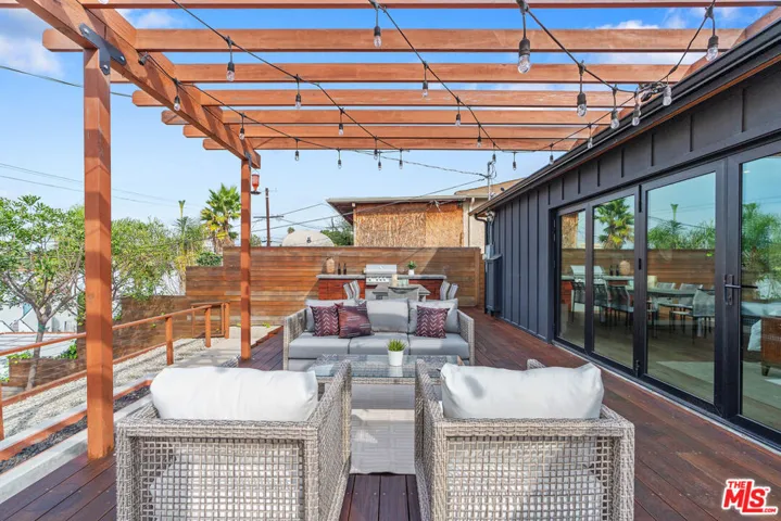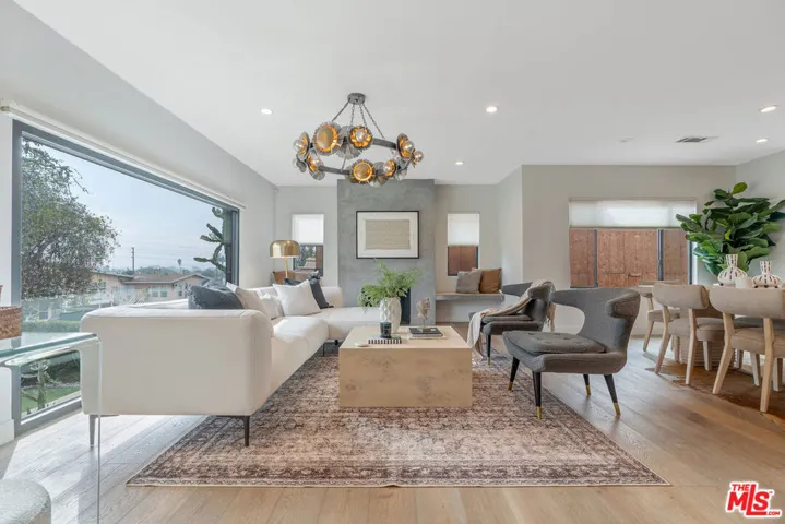 Modern farmhouse in highly desired Picfair Village. The gorgeous Ipe Brazilian Walnut entry deck seamlessly flows into the open-concept floor plan, with the living room, dining room, and kitchen merging into a spacious great room. The huge picture window, controlled by automatic Hunter Douglas window coverings, allows an abundance of natural light to flood the space with a glow. The high-end surface materials, such as the wide plank European Oak floors throughout, the white classic tiles, and Carrara marble countertops, are modern with a timeless flair. The kitchen, equipped with upscale appliances, is a cook’s dream. The spacious owner’s retreat, featuring a spa bathroom and a walk-in closet, opens seamlessly to the back Ipe deck and terraced yard. This expanded living space features separate areas for lounging and dining, along with a grill, gas fire pit, and outdoor TV, making it perfect for all your alfresco entertaining. The views from the decks are west toward Santa Monica and the gorgeous sunsets, and North to the Hollywood Hills. The systems of the home have been upgraded to include a tankless water heater, a 200-amp electrical panel, a roof, and energy-efficient windows. The attached 2-car garage has built-in storage and epoxy floors. The property is zoned LAR2. Drought-tolerant artificial grass and landscape rock make for a low-maintenance yard. It is time to enjoy this prime location near the Westside, Beverly Hills, Hancock Park, and West Hollywood.