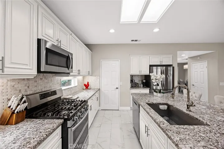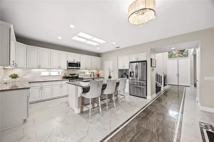 The formal living and dining areas welcome you with a grand foyer and crystal chandelier. The main level includes large custom tile flooring. The kitchen offers custom cabinetry, marble countertops, a center island with built-in sink, and a walk-in pantry.