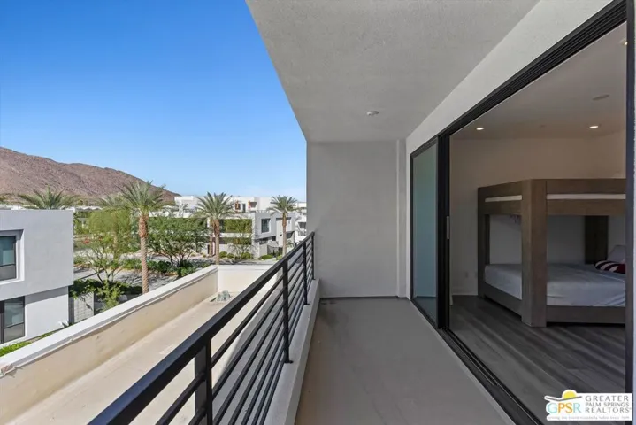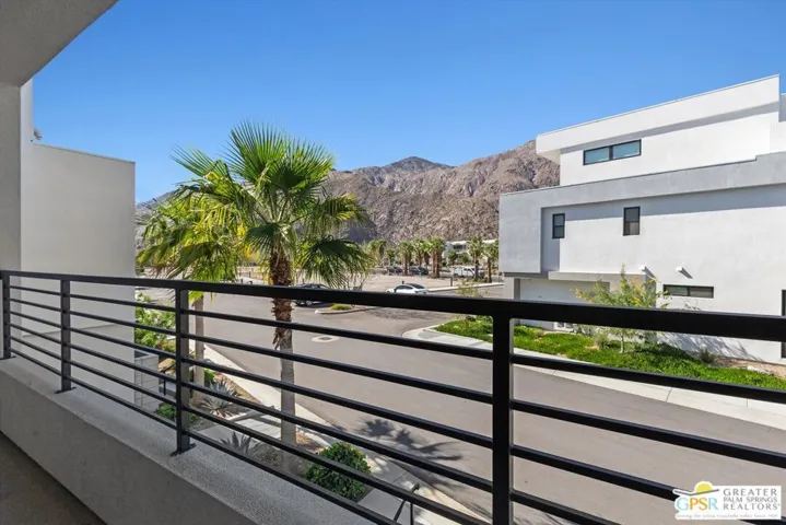 This stunning, highly upgraded condo in the desirable gated community of Cody Place offers the perfect blend of modern design and resort-style living; all framed by spectacular San Jacinto mountain views. As an end unit, this home is bathed in natural light with additional windows throughout, creating a bright, airy, and inviting atmosphere. The spacious great room and dining area are anchored by a gourmet kitchen featuring an oversized island, full-height cabinetry, stainless steel appliances, and quartz countertops with custom tile backsplash. Expansive sliding panel doors open to large covered balconies on both sides, seamlessly blending indoor and outdoor living and capturing breathtaking views from every angle. Upstairs, the primary suite serves as a private retreat with its own covered balcony and a spa-inspired bath with a generous walk-in closet. The upstairs den or office also opens to another covered balcony with unparalleled mountain and city views. The lower level features a private ensuite guest room with access to a secluded patio. Additional highlights include owned solar panels, porcelain tile and luxury vinyl plank flooring, and an attached two-car garage. Residents of Cody Place enjoy a beautifully designed clubhouse, two pools and spa, outdoor lounge and fire areas, BBQ, and a dog park; all within a secure, gated community that truly embodies Palm Springs resort living.