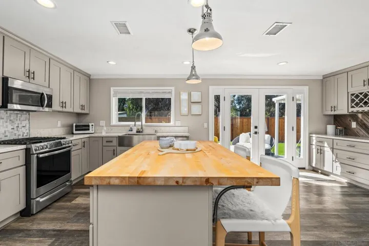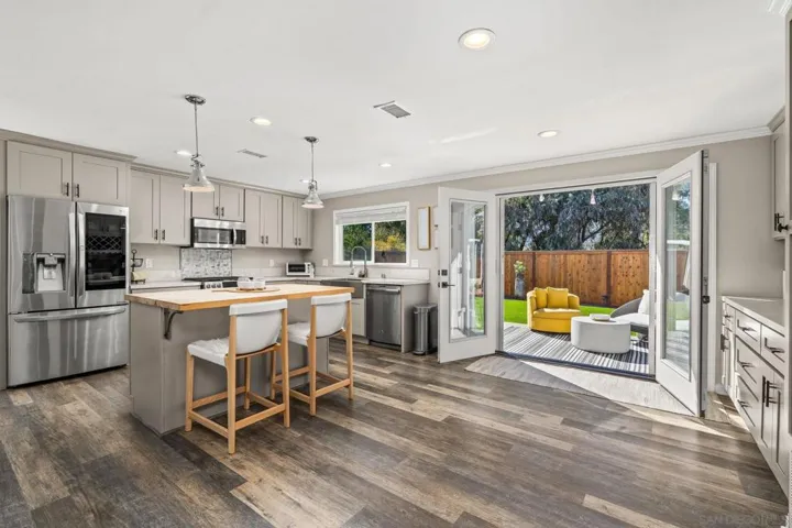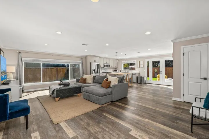 Well maintained 3Bed/2Bath, large kitchen to family room with built-ins and stainless steel appliances, oversized sink, pendant lighting over Island, canned lighting throughout the home, open floor plan with finished backyard, 2 car garage with sealed garage flooring in sought after Carlton Oaks neighborhood. Two full sized bathrooms with art decor tile, 1 with full size tub and 2nd with low threshold walk-in shower. This home was remodeled in 2019 and sellers have maintained its beauty along with finishing the backyard, adding turf and landscaping, retractable screen doors to accommodate French doors, renovated garage roof to slanted roof water roll off with double layering, glass storm door entrance and a new water heater. Agent related to Seller. Wild Life may or may not be seen from golf course. Golf balls may or may not be seen. Beautifully maintained interiors with LVP, Island with Woodblock top (never been used without a cover), large bay windows, 2 french door sets with one in the primary bedroom and one just off the kitchen/family room combo bringing the outside in with ease. Newer vinyl windows & large bay windows in family room along with the openness offer tons of natural light throughout the home. The 9,172 SF oversized lot has a Turf backyard, partially covered patio and mulch side yard, easy entry and storage side yard on opposite side of the home and plants on drip system for both front and back yards for easy maintenance. Backyard abuts Carlton Oaks Golf Course. Golf Course may or may not be upgraded with Hotel, Spa, new course and residential units. West Hills High School and Carlton Oaks school are nearby. Easy freeway access to both HWY 52 and HWY 125. Santee is a city with parks, recreation centers & sport facilities, its own Costco/Gas, Lowes, Kohls, Target, Home Depot, and multiple large shopping centers and strips for restaurants, groceries, yoga and more! See breakdown in docs of $162.40 for special assessments water, mosquito, fire, vector and other. Tax records show 4 Bed, but is a 3 bedroom. See prop info in docs.