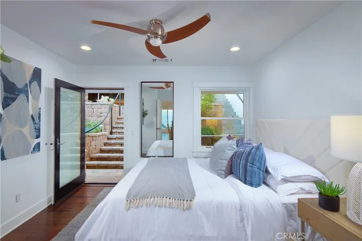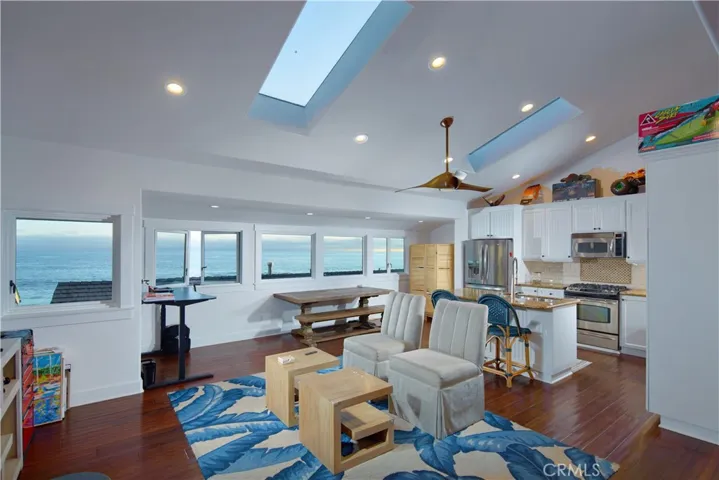 Retaining elements of its original 1963 vibe, including large ocean-view windows, open living areas, and vaulted tongue-and-groove ceilings, the main home boasts many of today’s most sought-after appointments. A stunning modern fireplace with natural stone and dramatic angles embellishes a great room that opens to a deck overlooking the beach via a wall of slide-away glass doors. The kitchen, living, and dining rooms also showcase ocean views, with the dining room occupying a prime bay-window setting. White cabinetry with glass uppers, waterfall-edge countertops, two bars, and high-end appliances adorn the kitchen, which is equally ideal for entertaining and mealtime preparations. This level’s primary suite opens to the central patio and reveals a luxurious bath with a jetted tub and oversized shower. On the lower level, a secondary primary suite joins a living area with a walk-in wet bar. A five-car detached garage is located at street level.