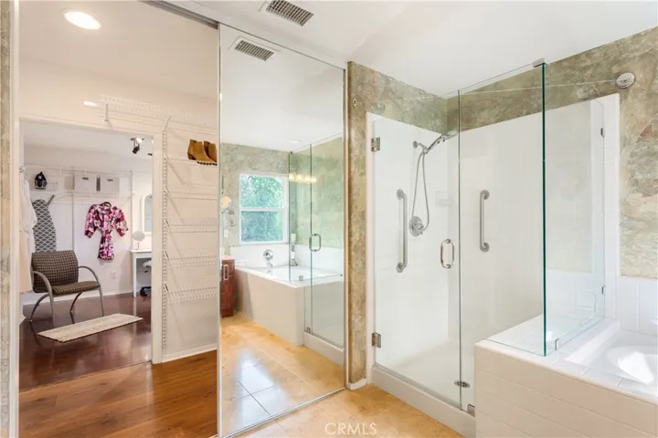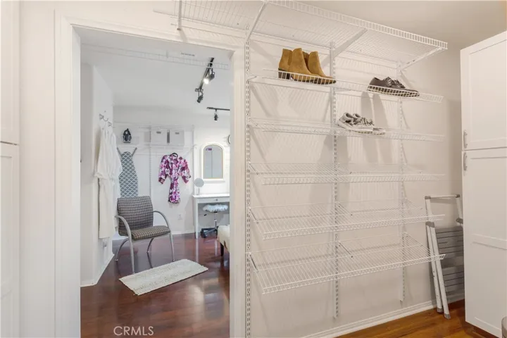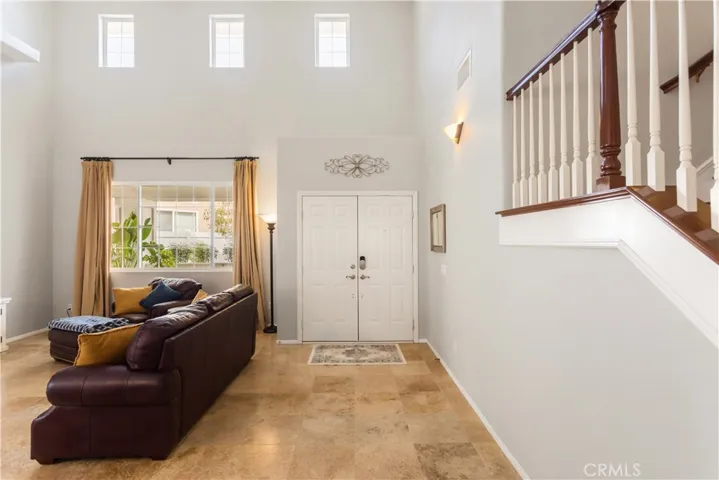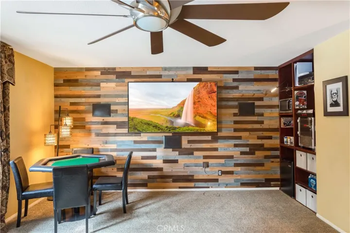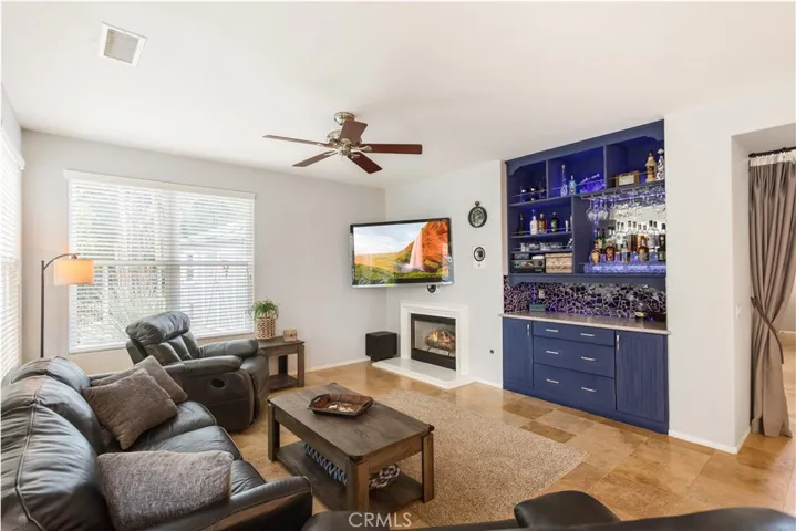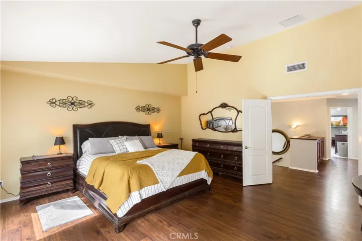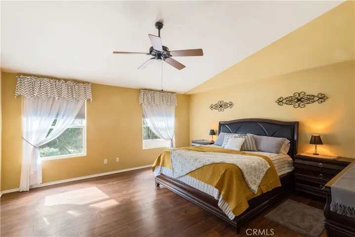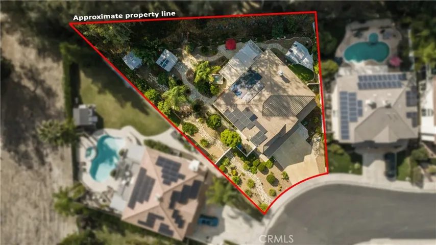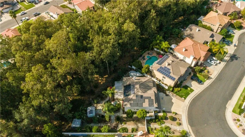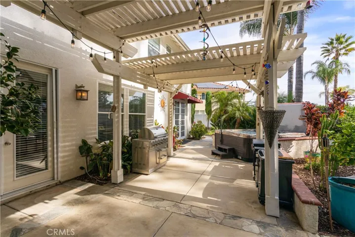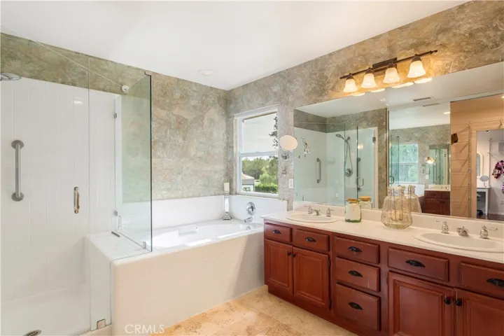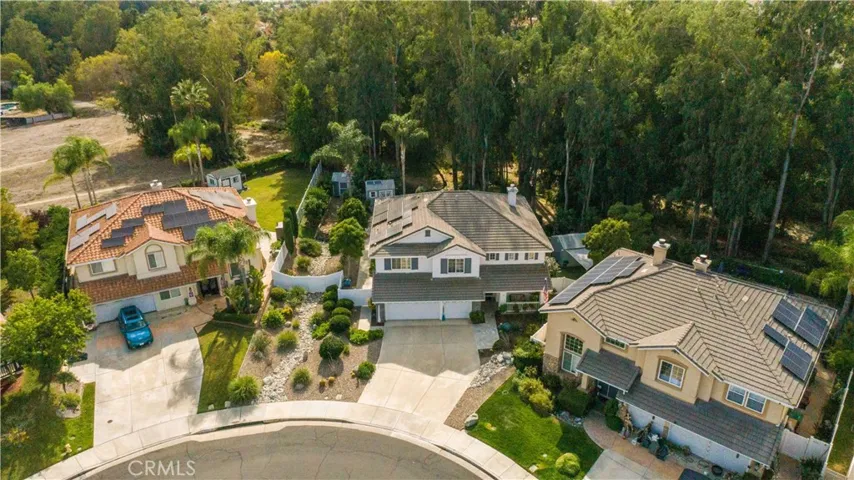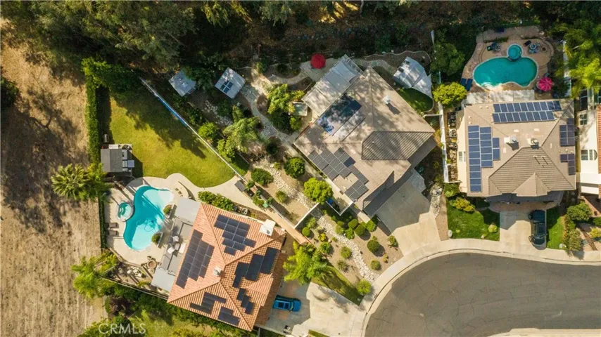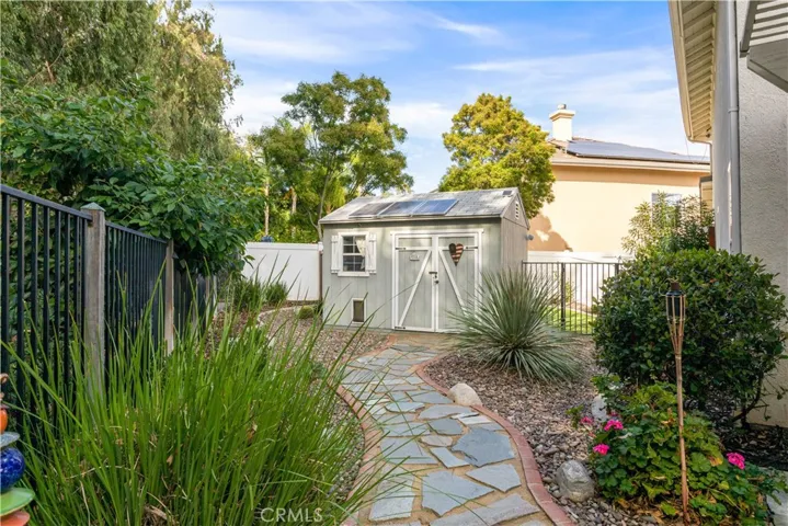 Welcome to a stunning and thoughtfully upgraded home featuring two primary suites, elegant finishes and a thoughtfully landscaped, low maintenance backyard oasis! A Monserrat Classic home in a well-established neighborhood. There is very little turnover in this tract because of the low taxes, great location and the quality of the homes. Pride of ownership is evident when you drive through the neighborhood. When you open the front door and walk into this beautiful home you are met with a vaulted ceiling and gorgeous Travertine floors. Family room downstairs has a fireplace and built-in bar area. The chef’s kitchen has double convection ovens, newer appliances, hanging pot rack & recessed lighting. French doors lead outside to the backyard and covered patio. Downstairs primary bedroom also has French doors leading to the backyard. The ensuite has a large walk-in closet, separate tub and shower and dual sinks. Separate laundry room downstairs offers a lot of storage and a sink. Upstairs there is another spacious primary bedroom with a barn door separating the bedroom from the ensuite. The ensuite has a soaking jet tub, separate shower, his and her sinks. The expansive walk-in dressing room/closet has a vanity and mirror. Two more bedrooms & full bath upstairs. The loft has been set up as a media room complete w/ black out curtains, rustic accent wall, surround sound speakers, and built-in area that has a microwave and mini refrigerator. This very private backyard backs up to a green belt/park area and is landscaped with slate and river rocks. No grass! There is a hot tub, 3 sheds including a SHE shed and a tool shed that are solar powered, outdoor speakers, and a covered patio. Fruit trees include an orange, lemon, lime, and grapefruit. There is also an irrigation drip system. A gate in the back fence leads to the green belt and walking trails. On one side of the house there is a dog run that has artificial turf, a built-in water dispenser and a shaded area. The flooring throughout this stunning home consists of Travertine and Pergo Max Premium flooring excluding one bedroom that has carpet. The three-car garage has epoxy floors, a built-in work bench, & of storage. Permanent holiday lights are installed and ready to use through an app on your phone. Ring cameras throughout the house. 24 solar panels are paid for with 12 more being leased. Has the potential to be a 5 bedroom home. An electrical outlet in the garage is suitable for EV charging.