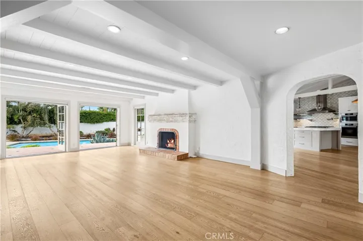 This extraordinary single-level, Santa Barbara–inspired estate is perfectly poised on a fully usable, one-acre lot in the heart of North Tustin with an increasingly rare offering of space, privacy, and timeless architectural beauty. Set on a private road, a serene walking path leads you to a gated courtyard entry, immediately signaling the tranquility, charm, and indoor/outdoor living that define this exceptional residence. Inside, the foyer unfolds into a warm yet sophisticated family room, where a wood-burning fireplace, exposed beam ceilings, and dual sets of French doors seamlessly connect the home to its expansive backyard. A spectacular remodeled kitchen is an exquisite culinary haven appointed with marble countertops, a farmhouse sink, breakfast bar, wet bar, and dramatic vaulted, beamed ceiling. A full suite of premium appliances includes a Dacor refrigerator and gas cooktop, Bosch dishwasher, Miele oven and convection microwave, and a beverage refrigerator, providing the ultimate experience for cooking, entertaining, and gathering. French doors open the kitchen to the front courtyard, while the adjoining living room, with its gas fireplace and additional backyard access, creates an effortless flow for everyday living and celebrations. The thoughtful single-level layout includes a dedicated left wing with four gracious bedrooms and two bathrooms. On the opposite end of the home, a private ensuite bedroom is complete with a shower-over-tub, walk-in closet, nearby laundry room, and powder room, and provides a flexible retreat for guests, an office, or multigenerational living. Elevated design details are showcased throughout, including plaster walls, white oak and Spanish tile flooring, and cordless window coverings. Outdoors, the magic continues on a raised Spanish-tile terrace overlooking the expansive entertainer’s yard, with a sparkling pool and spa, bocce ball court, meandering walking paths, planter beds, a generous grassy lawn, and lush mature landscaping. A two-car garage with additional storage further enhances the property’s functionality.