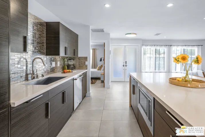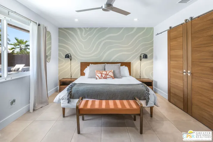 Welcome to the Palm Springs lifestyle, where endless desert skies meet California Cool. Whether you dream of a full-time residence or a successful vacation investment, this stylishly updated, move-in-ready home is perfectly positioned in a central location, just minutes from the downtown Design District, shopping, and award-winning dining. Step inside a flowing, open-concept space designed for effortless entertaining. The chef’s kitchen is the heart of the home, featuring stainless steel appliances and an oversized 8-foot quartz waterfall edge island ideal for culinary creations and casual gatherings. Sleek 17×35 tile flooring throughout provides a seamless cohesive aesthetic. The Primary Suite boasts a custom Elfa closet system, en-suite bathroom with an over-sized walk-in tiled shower and convenient access to the beautiful backyard. Enjoy spectacular sunsets and unobstructed west mountain views from the front patio, screened by a mid-century breeze-block wall, while the backyard is your true resort experience, featuring a pebble-tec pool with integrated spa and a spacious covered patio perfect for year-round relaxation. Currently a successful Airbnb, this property offers an immediate return. Plus, you’ll enjoy lower energy costs thanks to the low-monthly leased solar system. Situated on a cul-de-sac with no power lines in sight. Your turnkey oasis awaits, simply bring your suit and dive into the good life!