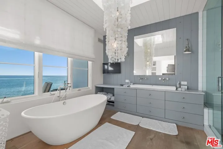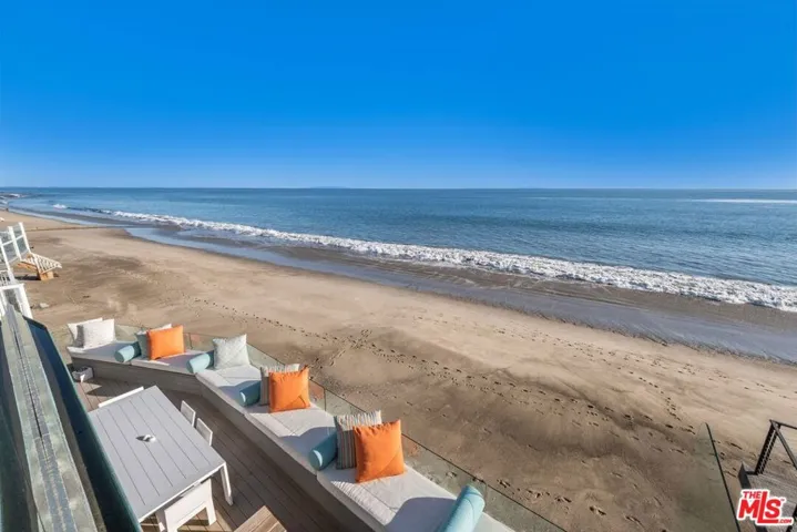 This Spanish contemporary beachfront property is located on the coveted & legendary Escondido beach. It is one of sandiest beaches in Malibu & stretches for miles in the east & west direction. The beach house is positioned facing south, so it captures the breathtaking sunrise over Santa Monica Bay & the sunset over Point Dume. The house was rebuilt in 2016 from the ground up & features a concrete foundation w/ caissons & one of the largest cantilevered decks on Escondido Beach, which sits suspended just feet above the sand allowing seamless private direct beach access. The guest enters the one-of-a-kind beach house via a gated arched entry, which leads to the hardscaped courtyard w/ large spa & mature olive trees. Behind the oversized iron front door reveals the spacious open floor plan w/ high ceilings, recessed lighting & hardwood floors. The kitchen features quartz countertops & high-end appliances, while the living & dining area has a spacious sectional w/ huge tv & plenty of seating for family & guests. Ready for the beach? Then head outside through the floor-to-ceiling sliding glass pocket doors to the expansive oceanfront deck w/ wraparound bench seating, built-in BBQ & private direct beach access. Adjacent to the living area is a cozy media room w/ bar, wine cellar & direct deck access. The second level features two bedrooms w/ Juliet balcony & bunk beds, multiple skylights & a grand oceanfront master suite complete w/ sitting area, balcony & panoramic ocean views from the Queen’s Necklace to Point Dume. There is plenty of parking in the two-car garage or designated parking area on the premises & is close proximity to world-class dining, shopping & entertainment. Private membership offering to the Sycamore Tennis Courts available.