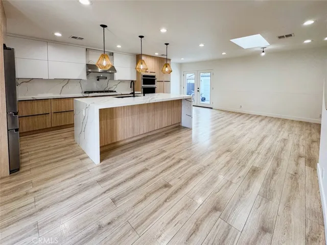 The light-filled open floor plan showcases skylights, recessed lighting, and modern finishes throughout. The chef’s kitchen features a large center island, quartz countertops, and stainless steel appliances—perfect for entertaining. Spacious bedrooms include custom closets, and designer bathrooms blend style and comfort.