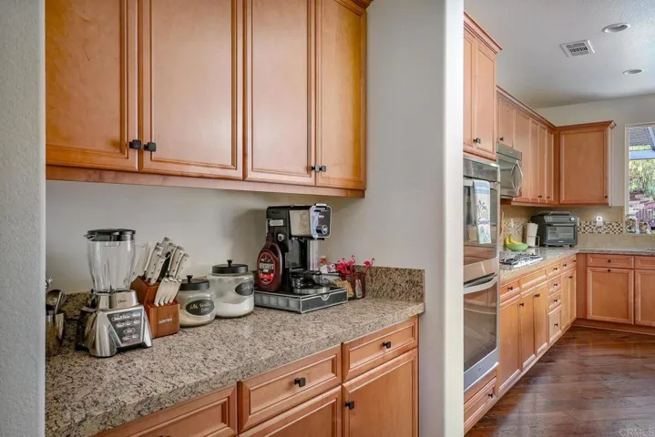 Seller offering Interest Rate Buy/Down to buyer who can close by 12/31/2025. A rare Michael Gregory Collection home in Woods Valley—crafted for elegance, comfort, and sustainability. Built in 2015, this residence sits in the exclusive Masters Collection, a gated enclave of just 16 distinct homes tucked “over the bridge” between scenic Vistas and the 17th hole of the Native Oaks Golf Course. Known for timeless architecture and superior craftsmanship, the Michael Gregory Collection represents the finest of Woods Valley living. Interior Excellence This home lives like a single story, featuring a main-level primary suite and two additional en-suite guest rooms on the first floor, complemented by two upstairs suites with a shared bath. The design blends open-concept living with thoughtful detail: 19-foot floor-to-ceiling precast fireplace anchoring the great room Formal dining room and convenient main-level laundry Hardwood flooring, plantation shutters, and vaulted ceilings Chef’s kitchen with double ovens, stainless LG appliances, 4 cm granite counters, and a large island Outdoor Lifestyle Set on 1.82 acres (with portions preserved as open space), the property is surrounded by mature trees, walking paths, and landscaped play areas. Outdoor entertaining is effortless with a motorized louvered pergola, expansive patios, and gardens designed for both beauty and efficiency. The yard features succulent gardens and exotic plantings, maintained by a dedicated micro water system. Energy Efficiency & Sustainability Beyond its 2×6 construction and energy-smart features—dual-glazed Low-E windows, 3-zone A/C, recessed LED lighting, occupancy sensors, sealed burners—the home is enhanced by a fully-owned 13.87 kW solar system (38 LG365 panels with SolarEdge inverters, installed 2019). Producing approximately 21,767 MWH per year, this system reduces electricity bills by —producing 111% of annual usage and saving the equivalent, while offsetting 24,000+ lbs of CO2 emissions annually. Additional updates include full gutters for durability and drainage peace of mind and fire surpression sprinker system. Why This Home Stands Out Exclusive double cul-de-sac location within Woods Valley’s most private enclave Expansive view lot overlooking open space and golf course Modern efficiency paired with timeless Michael Gregory craftsmanship Turnkey enhancements: motorized pergola, upgraded micro-irrigation, solar, gutters, and exotic landscaping 14128 Winged Foot Circle is more than a home—it’s a rare opportunity to own a piece of the Michael Gregory Collection in one of North County’s most serene gated communities. Beautiful inside and out, this property was designed for a lifestyle of elegance, efficiency, and effortless indoor-outdoor living.