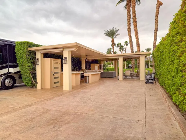 This stunning Outdoor Resort Indio lot overlooks the golf course, fountain, and bridge with sweeping mountain views and glowing afternoon sunsets. Your coach windshield faces east, welcoming gentle morning sun before the desert colors come alive each evening.The outdoor living area features a large pergola with a brand-new roof, electric privacy screens, and a comfortable lounge with entertainment center, sofa, coffee table, and dining for six. The impressive outdoor kitchen offers granite counters, stainless appliances — refrigerator, dishwasher, oven, BLAZE BBQ, 5-burner cooktop, sink with hot water, and abundant storage — all centered around a stylish island.With three ceiling fans, four ceiling heaters, a large storage closet with coded door, and surfaced RV pad with mid-lot hookups, this lot blends comfort, privacy, and convenience, just steps from pickleball, golf, and the clubhouse — the ultimate in resort-style RV living.Outdoor Resort Indio is a Class A RV only resort.