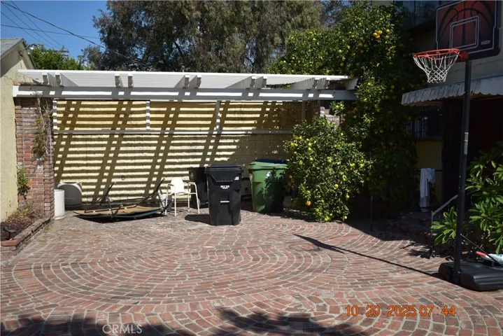 Explore the flexible floor plan with generously sized bedrooms, mirrored closets, ceiling fans and a central hallway with extra storage, plus upstairs bedrooms accessed by solid wood stairs. Cook, gather and imagine future upgrades in the classic galley kitchen with extensive cabinetry, tile counters, gas cooktop and double sink. Step outside and enjoy the expansive brick motor court that functions as a private outdoor living area—park multiple cars, entertain friends, or relax under the covered patio/pergola. see the potential to customize a character home in a central location close to Larchmont Village, The Grove, studios, museums and top dining. Buyer to verify square footage, bed/bath count, lot size and all permits.