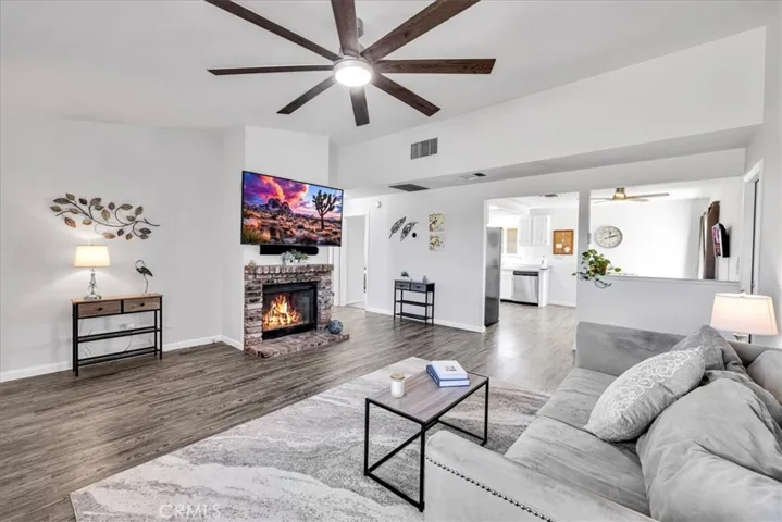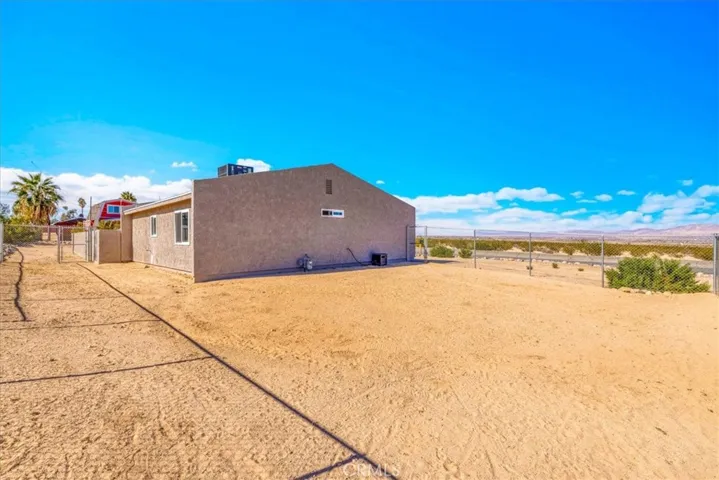 This Lovely Home is a Must-See! Being sold turn-key furnished, this is an amazing opportunity for all! Discover the perfect blend of comfort, style, and functionality in this beautifully updated home situated on a spacious corner lot. Set across from wide-open desert landscape, this property offers sweeping, unobstructed panoramic views to the North, enjoyed from both the exterior and the expansive picture window that brings the scenery right into your living room. Inside, fresh interior paint creates a bright, modern feel throughout. Newer laminate flooring compliments the cool tones. The cozy fireplace makes this the perfect place to unwind after a long day, or to host memorable gatherings with family and friends. This home is packed with upgrades, including a newer roof, newer HVAC system plus energy-saving evaporative cooling, new dual-pane windows, and a new garage door opener for added convenience. Fresh, plush carpeting enhances the bedrooms, while the bathroom showcases a brand-new tub and shower enclosure along with an updated vanity featuring double sinks. For additional comfort and versatility, a mini-split air-conditioning system has been installed in the garage, creating a pleasant environment for doing laundry, tackling projects, or completing everyday tasks. An attractive, large sliding glass door off of the kitchen leads to an inviting courtyard complete with a cozy firepit, perfect for evenings under the desert sky, outdoor dining, or relaxed gatherings with friends. Ideal for those who value outdoor space and versatility, the property features separate fenced areas perfect for pets, gardening, or gatherings with family and friends. With abundant parking, ample enough to accommodate an RV, you’ll have room for all your vehicles, toys, and guests. Move-in ready and thoughtfully improved, this home offers exceptional value, comfort, and unmatched desert vistas, all in one delightful desert package. Conveniently located just minutes from the 29 Palms Marine Corps Base. Don’t miss your chance to make it yours! Call an agent today!