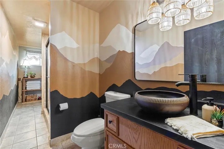 The spa-inspired bathroom offers a true retreat with a beautiful vanity and countertop, distinctive ceramic vessel sink, glass shower doors, black fixtures, and updated lighting, including a new exhaust fan. Every element reflects care and modern design.