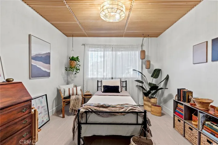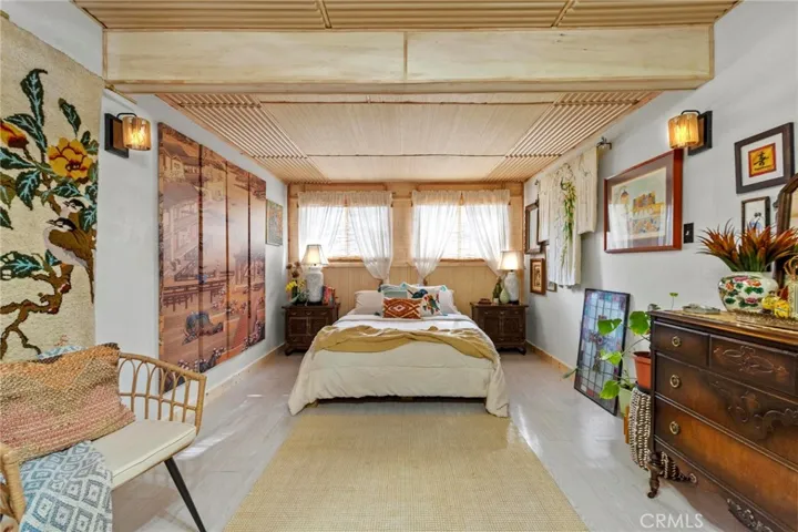The master bedroom features a beautiful bamboo accent wall and ceiling treatments that add dimension and warmth, complemented by custom lighting. The secondary bedroom is light-filled and inviting, while modern low-profile fans throughout the home ensure style and comfort in every space.