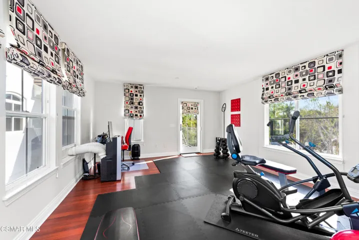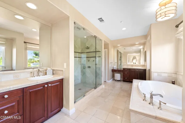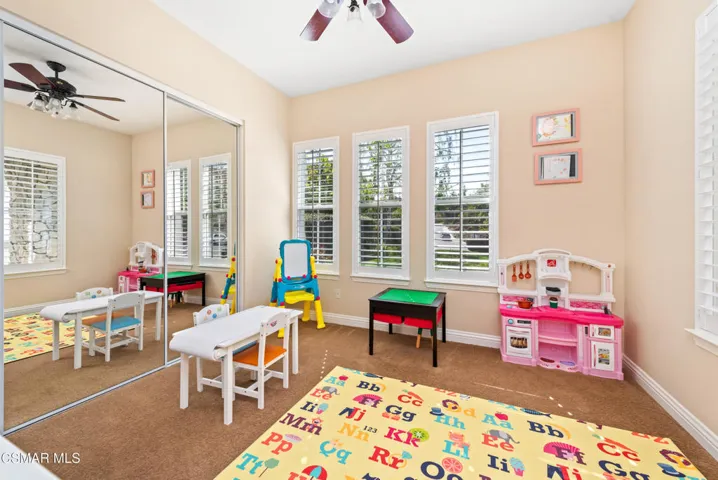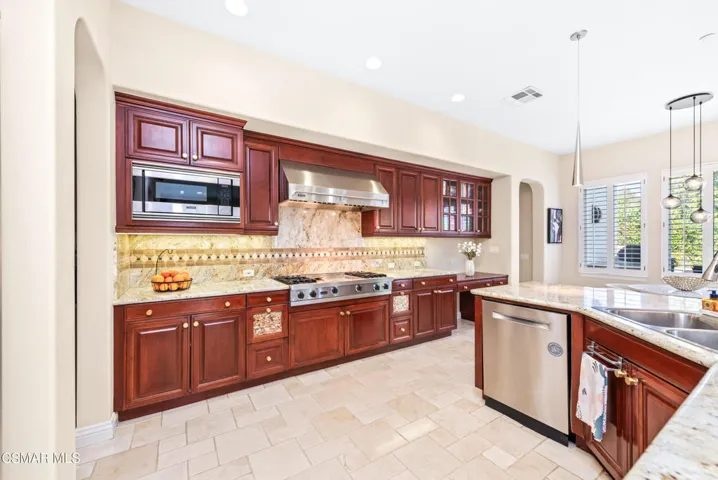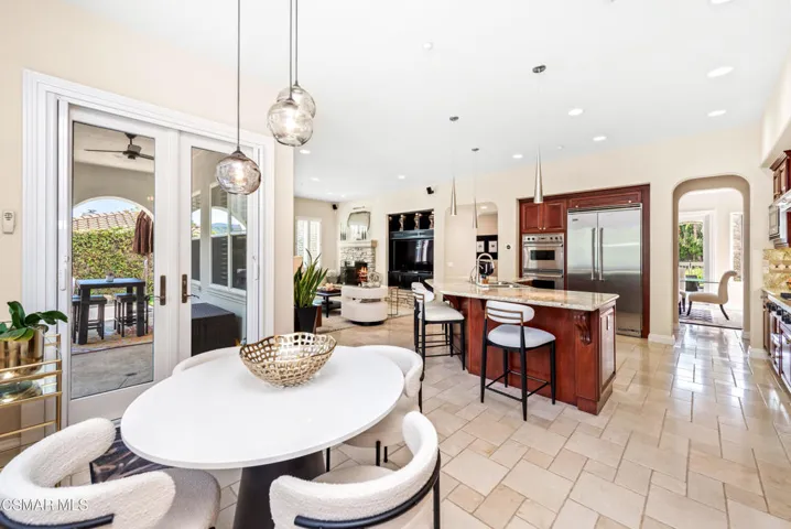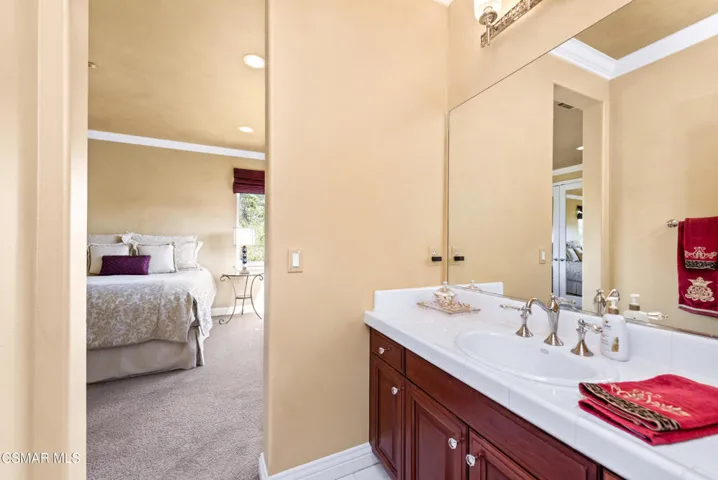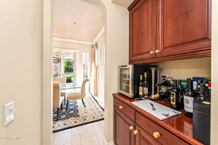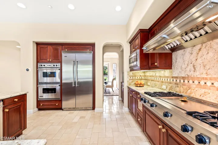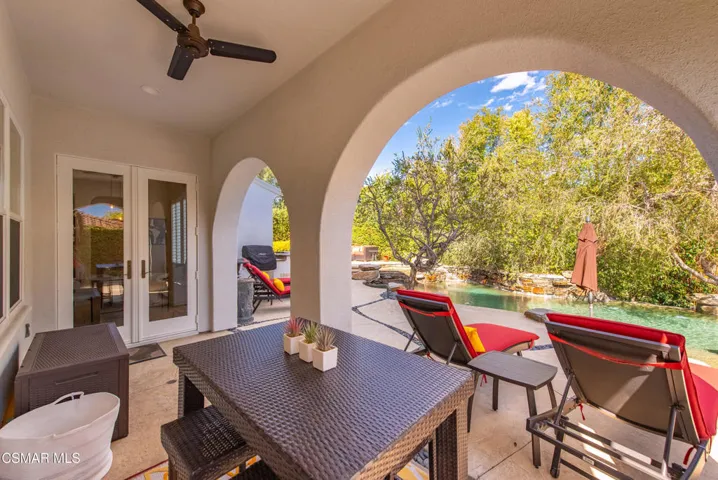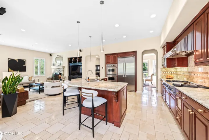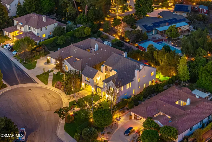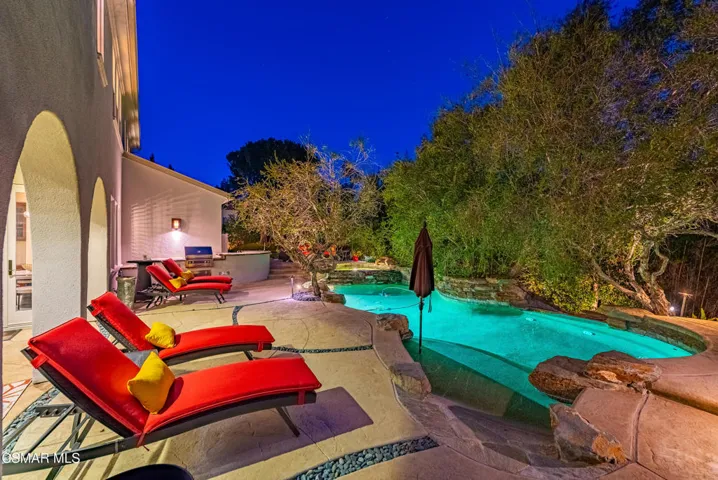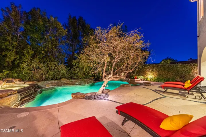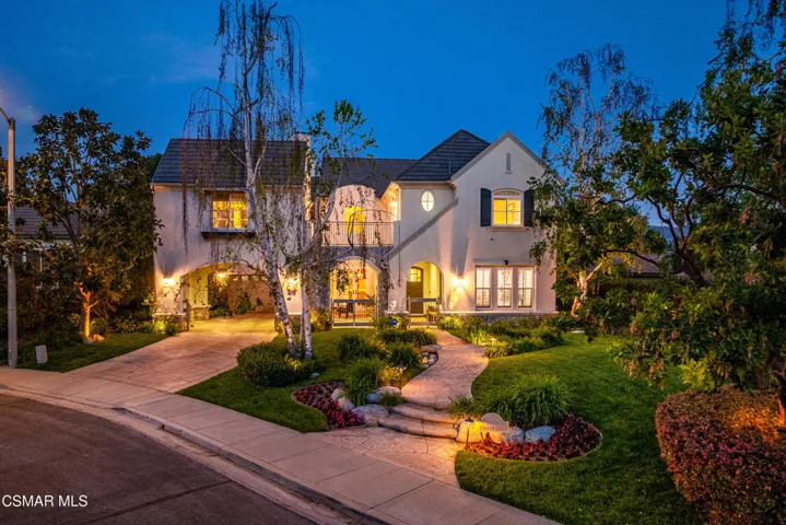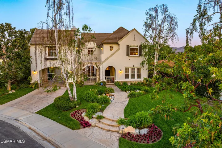 Impressive curb appeal on this exquiste home with lush landscaping, porte-cochere and courtyard entry.The home features a thoughtful layout with a guest quarters and a beautiful staircase right off the entry. The formal living room is perfect for entertaining, with an elegant fireplace and flowing seamlessly into the formal dining room which includes a built-in china cabinet and doors that open to the entry courtyard. The outdoor fireplace, creates a great space to enhance your dining experiance.The kitchen and family room are the heart of the home, offering an open and airy feel. Whether you’re gathering around the breakfast bar or sitting in the nook, the modern fireplace in the family room adds warmth and comfort. The kitchen boasts a large walk-in pantry, ample counter space, and high-end Viking appliances that will please any chef. Upstairs, there are four spacious bedrooms. The primary suite is very spacious and quite luxurious with a cozy sitting room with a fireplace and balcony. The tree top views add to this tranquil and private space. The private bath has been redsigned with enlarged shower, soaking tub and large walk-in closet. 2 of the upstairs bedrooms are joined by a bath The 4th bedroom has a private bath. A large bonus room, currently used as an office, is conveniently located near the secondary bedrooms. A detached studio above the porte-cochere adds even more living space, with endless possibilities for use. It’s accessible from the upstairs hallway via a bridge walkway, making it a unique feature of the home. The backyard is designed for both relaxation and fun, with a built-in BBQ, infinity-edge pool, and stone waterfalls. A hidden garden/play area sits just behind the pool, offering a private retreat. The 3rd stall garage has been converted to wonderful storage space. Westwood Ranch is located in the beautiful Wood Ranch area and is close to Regan Library and 23 frwy for quick access to Conejo Valley. This home offers plenty of space, modern amenities, and a great layout for living and entertaining.