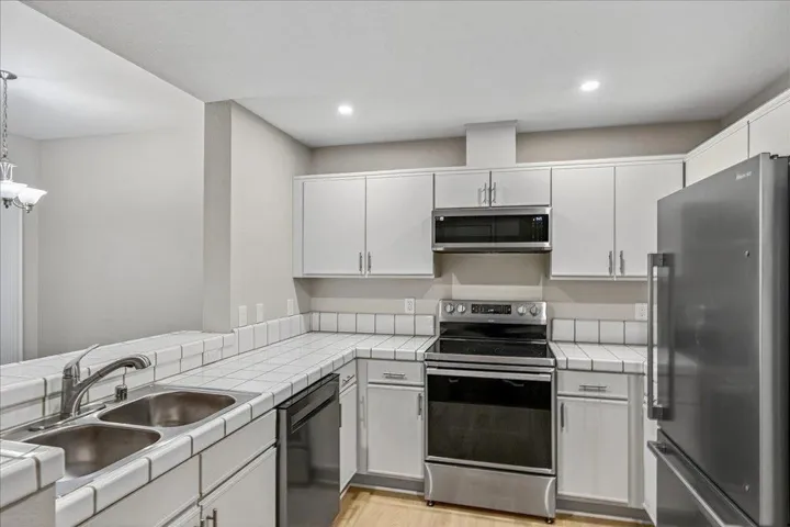 High ceiling and move in ready! Nicely updated with full size in-unit laundry room.Your own Garage! And 1 extra Assigned parking spot. Fireplace! HOA $494. 2 Pets allowed. Rentable (more than 30 days)! Easy location to freeway access and Cal Train. Kitty Corner to a park with playgrounds and tennis courts. End unit. Tree top window views. New stainless steel appliances. New faucets, New bathroom vanity, toilet, glass shower. Flooring in kitchen, laundry room, bathroom and bedrooms, all new! New paint! Totally move-in ready. Click Virtual Tour for more pictures. Great location. Great rental potential, commute by train to SF.