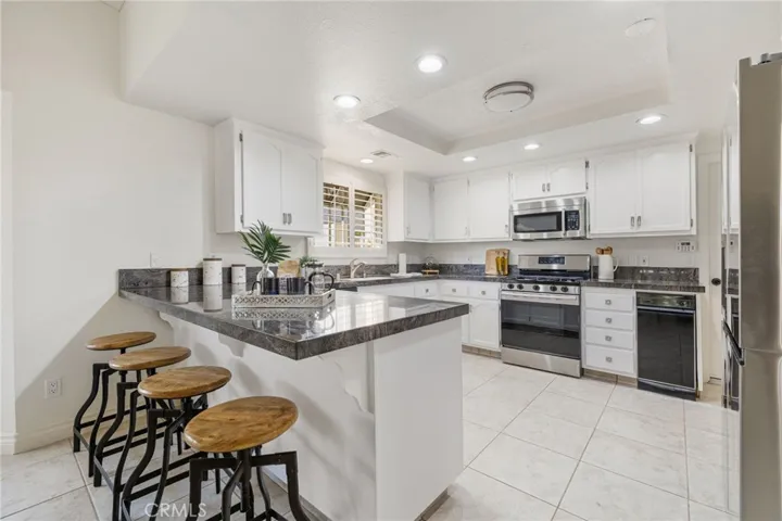 The kitchen features granite counter tops with breakfast bar, freshly refinished cabinets, a greenhouse window, and includes a stainless steel refrigerator. The kitchen has direct access from the garage to make unloading groceries very convenient. The indoor laundry room comes complete with washer and dryer included.