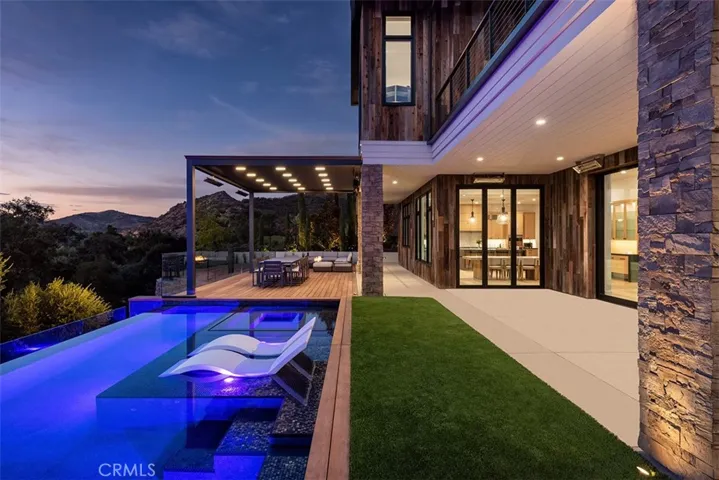 The backyard is made for fun and relaxation. A widened infinity-edge caisson pool (one of the largest in the neighborhood), spa, tanning ledge, built-in BBQ center, and a cozy pergola with remote-controlled heaters create an ideal setting for entertaining or winding down after a long day.