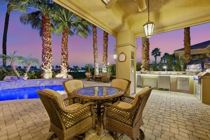 PRICED TO SELL. MUST SEE TO TRULY APPRECIATE THE OUTSIDE OASIS.Welcome to an exceptional 3 bedroom, 4 bath, 2,975 sq. ft. residence offering unmatched desert living with spectacular views overlooking the 15th fairway and tranquil lake with mountain views. This home delivers on comfort – with large guest rooms/ensuites, attached casita with private entrance, soaring ceilings, large closets and plenty of privacy for everyone. It provides a beautiful blend of luxury, comfort, and resort-style amenities throughout.The backyard is a majestic outdoor oasis, designed to create a truly unforgettable experience day or night. Enjoy a sparkling pool and raised spa surrounded by custom fire pots, ambient tiki torches, and a cozy courtyard fireplace. The highly upgraded outdoor kitchen is an entertainer’s dream, featuring Lynx BBQ, PIZZA OVEN, ICE MAKER, and REFRIGERATOR with generous prep space–perfect for hosting gatherings under the desert sky.Inside, the open-concept living spaces are warm and inviting, with custom fixtures, stacked stone and thoughtful upgrades throughout. The gourmet kitchen boasts Viking appliances (ex fridge), an expanded island, and upgraded stone countertops, offering both beauty and functionality. A fabulous bar with a custom wine room adds a sophisticated touch and creates an ideal setting for memorable evenings with family and friends.The home has been enhanced with modern conveniences including newer AC units and water heater, epoxy garage floors, and elevated finishes in every room.Offering panoramic views, luxurious upgrades, and an incredible indoor-outdoor lifestyle, this home truly captures the essence of desert resort living. A rare opportunity to own a meticulously maintained and beautifully upgraded residence in a premier location.