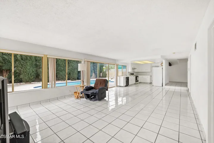 Welcome to 2385 Justin Ave, located in the prestigious Mountain Valley Racquet Club Tract. This builder Larwin’s expansive 2-story, 5-bedroom, 3-bathroom mid-century modern Bel Aire model floor plan spanning 2,696 sq. ft., seamlessly blending timeless elegance with modern comforts.Enter through double doors into a dramatic step-down living room with 18-foot ceilings, a large picture window, and a striking whitewashed wood-burning gas fireplace. The adjacent formal dining room, highlighted by an exposed wood beam, flows into an open kitchen and family room. The kitchen features a pass-through patio window, perfect for summer pool parties.The spacious family room, with signature garden window walls, is light-filled and inviting. Sliding glass doors lead to a newly renovated pool, ideal for relaxation or gatherings.Downstairs, a versatile bedroom doubles as an office, guest room, or maid’s quarters, complete with a 3/4 bathroom featuring a walk-in shower. An interior laundry room connects to the 2-car garage with direct access. Upstairs, the large primary suite offers a vanity, walk-in closet, and abundant natural light. Three additional bedrooms, one with a walk-in closet, and a second bathroom with a tub-shower combo provide ample space.The Mountain Valley Swim & Racquet Club community enjoys a low HOA fee providing exclusive access to community pools, tennis courts, basketball and volleyball courts, a playground, picnic area, and a reservable clubhouse with a full indoor kitchen. Located near top-rated schools, parks, and shopping, 2385 Justin is a rare gem in the heart of Simi Valley. Don’t miss this opportunity to own in a coveted neighborhood.