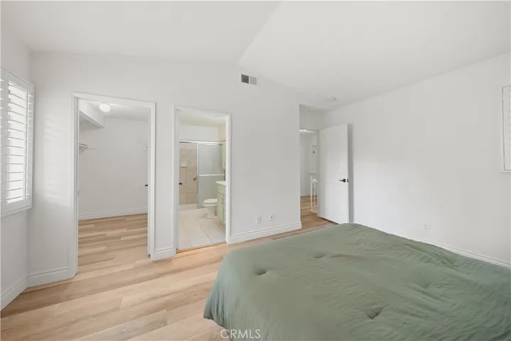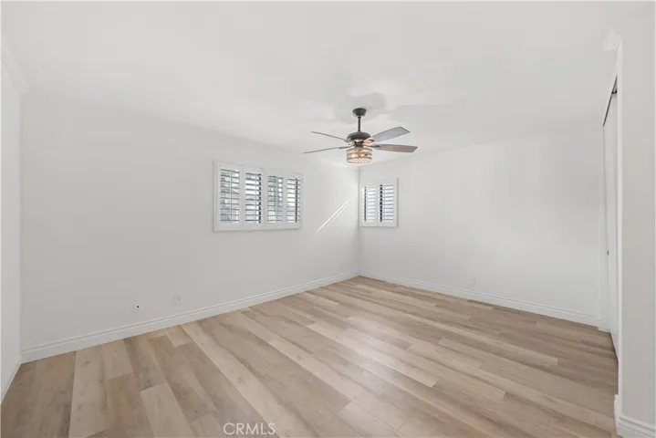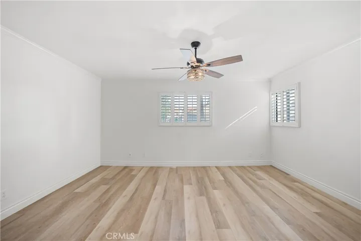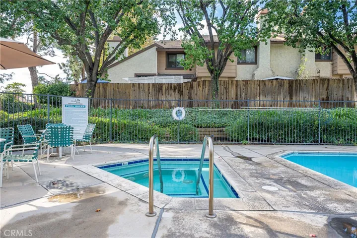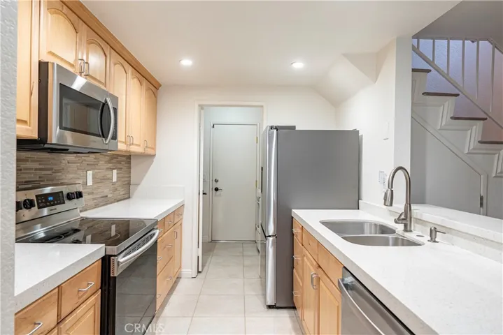 Move-in-ready two-story townhome in the Alta Loma Woods community, offering an open floor plan, central AC, and direct-access 2-car garage with epoxy flooring. The living room features a painted brick fireplace, plantation shutters, and a sliding door to a private backyard with a full-length covered patio and ceiling fan. The kitchen includes quartz countertops, mosaic tile backsplash, stainless steel appliances, recessed lighting, a dual-basin sink, and a pass-through bar to the living area. Adjacent dining area offers backyard views and tile flooring. All bedrooms are upstairs, each with its own bathroom. The primary suite includes vaulted ceilings, two closets, plantation shutters, and a full bathroom with tiled shower surround and updated cabinetry. The second bedroom features a walk-in closet, updated ceiling fan, and an ensuite ¾ bathroom. Additional features include crown molding, neutral paint, wood-look flooring throughout the upper level, and tile flooring on the main level. The downstairs powder room offers a pedestal sink and beadboard wainscoting. The separate laundry room provides upper storage cabinets and direct access to the garage. The private backyard includes space for outdoor dining or lounging. Community amenities include a pool, spa, clubhouse, and landscaped greenbelts with walking paths. Convenient access to the 210 Freeway and close to shopping, and multiple local parks including Miller Park and Red Hill Community Park.