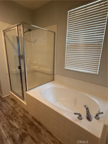 The primary suite is a relaxing retreat with laminate flooring, a ceiling fan, and faux wood blinds. The primary bath features dual sinks with a vanity area, a large soaking tub, a separate shower, a linen cabinet, and a spacious walk-in closet with abundant built-in storage.