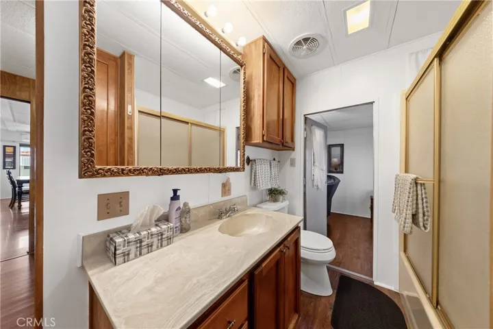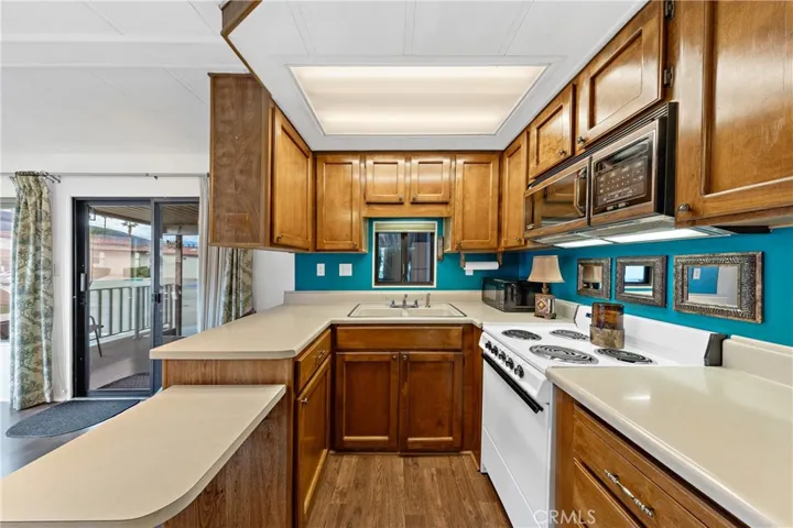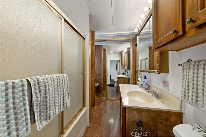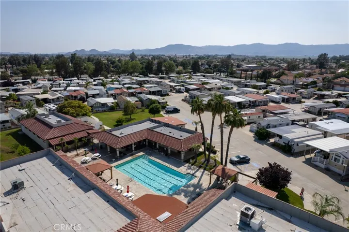 Truly exceptional park model home with bonus room in Heritage Ranch senior RV resort gated community. Gorgeous view of the mountains from the front room and covered patio deck. Step-saver kitchen has real wood finished cabinets, Formica counter tops, mini breakfast bar, electric stove, and refrigerator. Unique floor plan boasts a center bedroom with dual mirrored wardrobes and full bath (tub/shower combo), built in linen storage, and a exceptionally large vanity area for a park model. Insulated and permitted 8.5 x 17.5 bonus room accessible from the interior of home. Mini-split ductless heat and air plus a wall A/C. Newer Laminated wood flooring and custom honeycomb blinds throughout. Ceiling fans. Storage shed. Special feature: Outdoor heat lamp to keep guests cozy while enjoying a view of snow-capped mountains. HOA fee includes sewer, trash, water, basic cable and internet.