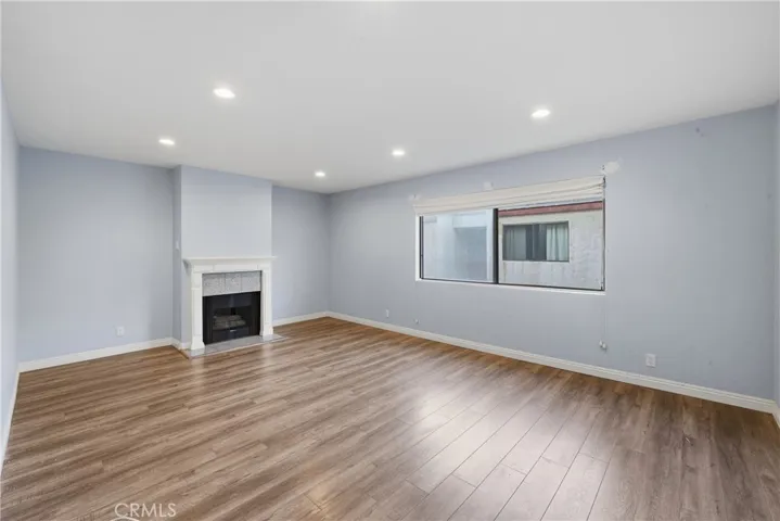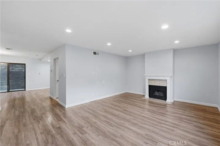 A move-in ready 3 bedroom, 3 bathroom condo featuring an open kitchen concept with newer appliances and a functional kitchen island that overlooks the living room. The living room includes a cozy fireplace and provides direct access to a private back patio.