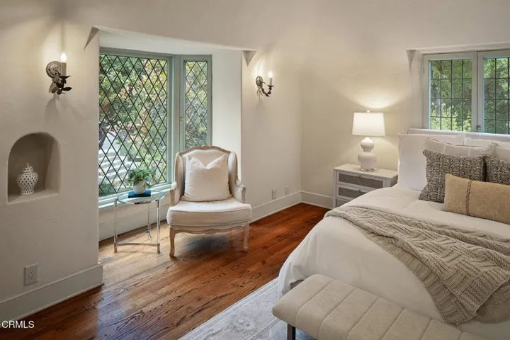 Welcome to Valley View cottage–a treasured piece of Pasadena’s architectural heritage designed by Wallace Neff nearly a century ago. One of thirteen beautifully restored cottages on the gated, luxurious grounds of the 5-star Huntington Hotel, Valley View was built in 1926 for the hotel’s long-time owner and manager D.M. Linnard. Rich with timeless character, the residence blends Tudor Revival and storybook cottage styles with hints of a Grimmian fairytale. As you enter, striking interiors and design flourishes echo the home’s impressive exterior. In the great room, a nearly 20′ ceiling features exposed trusses and beams, creating a grand space for entertaining. The formal dining room glows with natural light from a 30′ wall with diamond-shaped mullioned windows while the beautifully updated eat-in kitchen connects to a sunlit breakfast room. Completing the main level, you’ll find a guest bedroom / media room, three-quarter bath, and the luxurious primary suite with private balcony and spa bath. Upstairs, two bedrooms share a bathroom, with the southeast bedroom featuring a private balcony and sweeping valley views. As a resident of Huntington Circle, you’ll enjoy direct access to the Langham Hotel’s world-class amenities–from lush gardens to fine dining. Combining exquisite architecture, modern luxury, and unmatched convenience, Valley View invites you into a timeless storybook setting where your happily-ever-after unfolds.