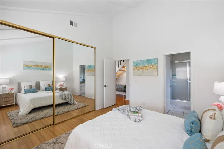 Ideal Interior Street Location: Beautiful two-story home offering 3 bedrooms and 3 bathrooms with showers. The floor plan is designed with a primary suite on each level. This spacious 1,460 square foot features an open and bright floor plan designed with vaulted ceilings on both levels, and hardwood flooring throughout the main level. Upon entry, you’re welcomed by a formal foyer leading to the formal living and dining rooms, both enhanced by high-volume ceilings, a cozy wood-burning fireplace and plantation shutters. The separate family room is also highlighted with vaulted ceilings and upgraded French doors to the backyard. The bright kitchen includes upgraded cabinetry and countertops, recessed lighting and beautiful views of the relaxing pool and spa. Two of the bedrooms are on the main level, including a primary suite with an en-suite bath. The additional primary suite with private bath is on the second level. This suite is highlighted with vaulted ceilings. Additional highlights includes soft water and solar panels with a 25-year panel warranty and lifetime installation warranty – and fully owned. Enjoy a spacious backyard with a refreshing pool and spa, plus fresh landscaping in both the front and back yards. This excellent location is just a short walk to Central Park – one of Orange County’s gems – featuring basketball courts, tennis courts, a softball field, playground, and gazebo. Highly desirable La Palma School District includes access to nationally recognized Oxford Academy.