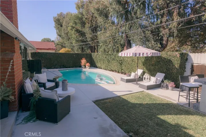 Updated single-level pool home with a private manicured backyard. This three-bedroom two, two-bathroom home is warm, inviting, and filled with designed touches. Natural hardwood floors flow throughout the house. Beautiful double French doors open onto the entertainers’ backyard with a pool and built-in BBQ with bar seating. Upgraded kitchen with granite counters, gas range, refrigerator, and wine refrigerator. Ceiling fans in each bedroom. The garage has been updated with epoxy flooring and new storage cabinets and can be used as additional office space. The cozy living room is complete with a wood-burning fireplace. The back gate opens onto a tree-lined park with walking trails and a playground. The owner pays for pool and gardening services.