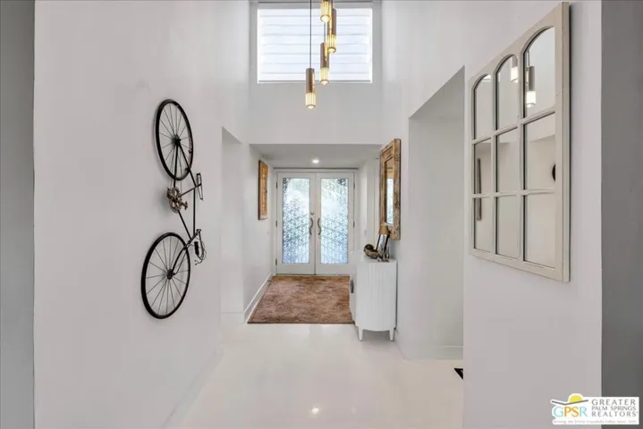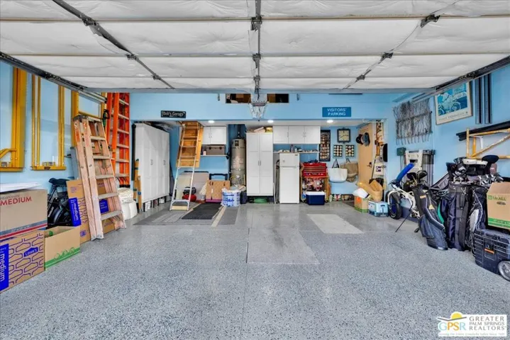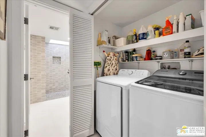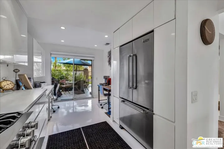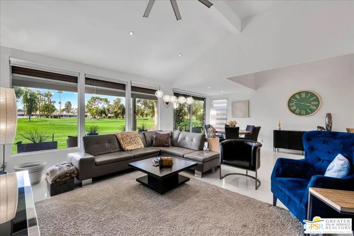 Imagine waking up to sun-drenched mountain vistas on the 6th fairway of Cathedral Canyon’s championship course. This single story 2-bed, 2-bath golf-front gem with a coveted attached 2-car garage is calling you home: no stairs, no neighbors above, just pure desert magic. Step through your spacious private tiled front patio with soft timer lights into vaulted ceilings, skylights, and gleaming white floors flowing through an open floor plan. The beautifully remodeled kitchen showcases Viking appliances, sparkling quartz, custom glossy white cabinetry, and a breakfast bar ready for morning coffee or sunset cocktails. Cozy up to the gas fireplace as natural light pours through a wall of glass leading to your covered rear patio with ceiling fan, recessed lighting, and unobstructed fairway and mountain views, your personal oasis for al fresco dining or stargazing. The primary suite offers a remodeled en-suite bath with a dual vanity and an elegant, spa-inspired tiled shower. The guest bedroom includes a queen Murphy bed and excellent additional storage cabinets ideal for visitors or a comfortable home office. The guest bath is also fully updated with modern finishes and a walk-in shower. Additional upgrades include ceiling fans, custom window coverings, and a newer Samsung washer and dryer. The attached garage features an epoxy floor, built-in cabinetry, and a second-story loft for extra storage. A short stroll takes you to one of the community’s sparkling pools and spas within this secure, gated enclave. HOA includes Wi-Fi, basic cable, trash, sewer, exterior maintenance, roofing, landscaping, and access to six pools and spas. This isn’t just a condo, it’s your desert retreat come to life.