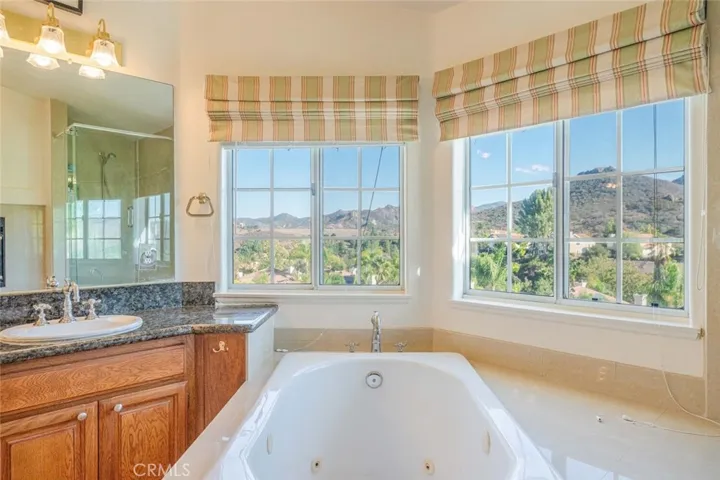 Set on a peaceful cul-de-sac in the desirable Three Springs neighborhood, this VIEW home features 5 bedrooms and 4 bathrooms, offering privacy, elegance, and modern style. The property is just minutes from Three Springs Park, Westlake Lake, the area’s best dining, and within the award-winning Las Virgenes School District. Step through double doors into soaring ceilings, a step-down living room that opens to the dining area, and a dramatic sweeping staircase. The thoughtful floor plan includes two bedrooms and two bathrooms on the main level—one currently used as an office/den and another as an ensuite guest room—offering flexible living options. The spacious family room flows into a breakfast nook and large kitchen with a walk-in pantry, perfect for everyday living and entertaining. Upstairs, you’ll find a bright open loft (which could easily be converted into a sixth bedroom if desired), two additional bedrooms, and an expansive primary suite. The large primary has a double sided fireplace, and captures stunning views of the Santa Monica Mountains. The private backyard offers a covered gazebo, a large deck, fruit trees, low-maintenance landscaping, and incredible views. Seller may consider a lease. Three Springs is an exceptional community with tree-lined streets, a central park, and the peaceful beauty of Westlake Village living.