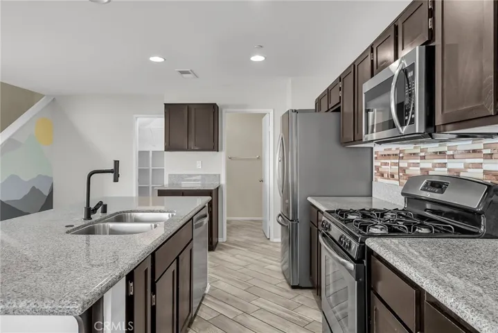 Beautiful Move in Ready Canyon Hills Community Home. Located near all the wonderful community amenities. The front porch welcomes you up to the home. As you enter the wood look tile flooring that runs throughout the lower level sets the tone of the upgraded decor this home offers. There is a bedroom and full bathroom on the first level. The kitchen and great room are bright and offer the open floor plan design. The great room is a large room that provides the perfect space for relaxing. The kitchen has an abundance of cabinets and counter space. The island is large and provides an area for casual eating as well. The walk-in pantry is larger than average and ready for that “Pinterest” dream design. The kitchen is complete with stainless-steel appliances and stone counter tops. Upstairs the laundry room offers convenience and additional storage areas. The Primary suite, 3rd and 4th bedroom are located on this upper level. The Primary suite is situated towards the rear of the home, and you can enjoy the view of the hills behind you. The primary bathroom offers a dual sink vanity and oversized closet. The additional bedrooms are good size and share the 3rd full bathroom. The rear yard is a good size with privacy since there are no rear neighbors. The large cement patio area and artificial turf make the space very easy to maintain. The home is equipped with solar to add to the overall affordability this home offers. The Community amenities rival many 5 star resorts and offer a variety of sport fields, parks, walking trails, pool, and so much more. There is something for everyone. Canyon Hills is located where commuting is easy in all directions, Head down South or into Riverside and Orange County. Shopping and restaurants are all near-by and it is just a short drive into Temecula to enjoy local wineries.