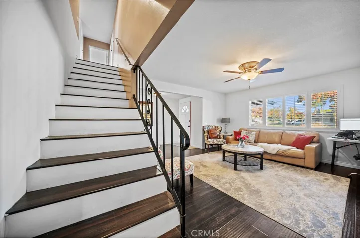 The inviting living room is perfect for gatherings, featuring a cozy fireplace and beautiful wood-like engineered flooring that flows throughout the common areas. Elegant window shutters provide privacy.