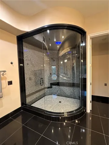 The luxurious master suite is a true retreat, complete with its own fireplace, two large walk-in closets, a Jacuzzi tub, an oversized shower, and a private balcony offering sweeping views of the pool, mountains, and city lights.
