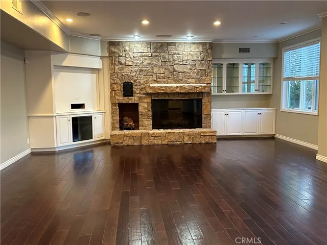 Upon entry, the grand foyer welcomes you with a dramatic curved maple staircase. The formal living room features a marble fireplace and gleaming wood floors. A spacious family room boasts a towering rock fireplace, French doors, and an expansive kitchen equipped with granite countertops, a large island, dual Sub-Zero refrigerators, a commercial-grade range, and a Viking dishwasher.