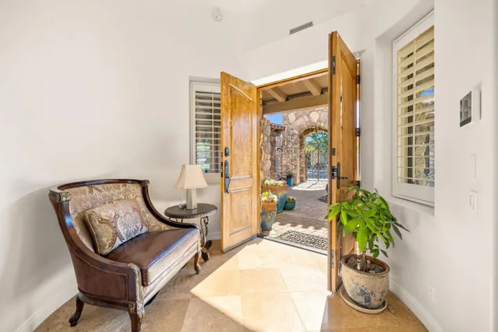 This magical Italian villa in Stone Creek Ranch was built for the developer, on the most desirable lot and upgraded throughout. Ideally located near world-class golf courses; Andalusia, PGA West, and The Madison Club to name a few –and just minutes from the Coachella venue, the property offers both exclusivity and convenience. The 4-bedroom, 5-bath layout includes a 2-room detached casita and 3,588 sq. ft. of refined living space with travertine floors, timeless granite, stainless appliances, a full bar, and a formal dining room with a beamed ceiling.The great room is highlighted by pocket sliding glass doors, custom built-ins, surround-sound, and a stone fireplace, while the primary suite features a beamed ceiling, a stone fireplace, and a luxurious bath. Outdoors, enjoy an infinity-edge pool, sunken BBQ pit, custom pergola, and a creekside setting with dramatic mountain views. Make an appointment for your own private showing today!